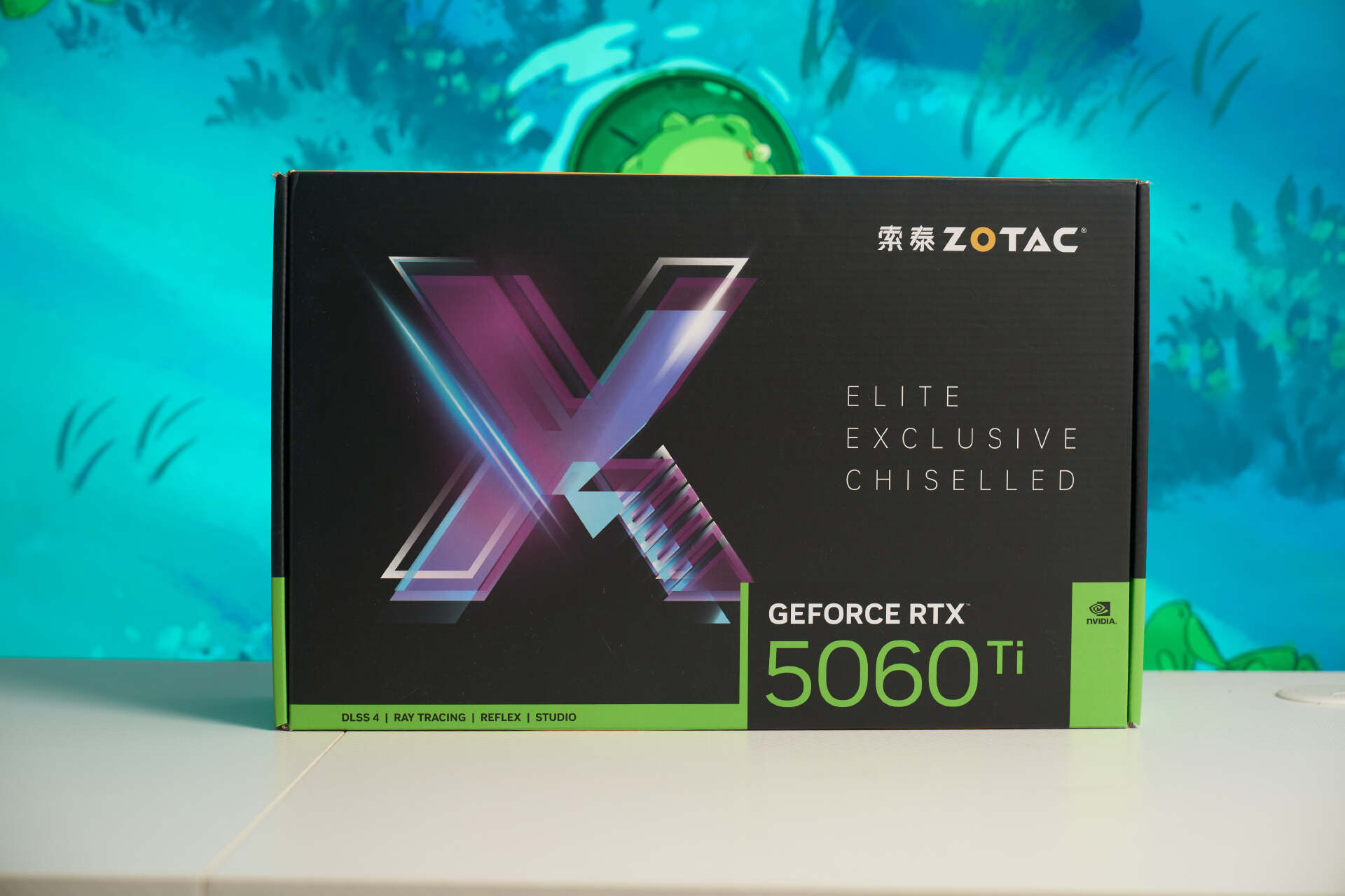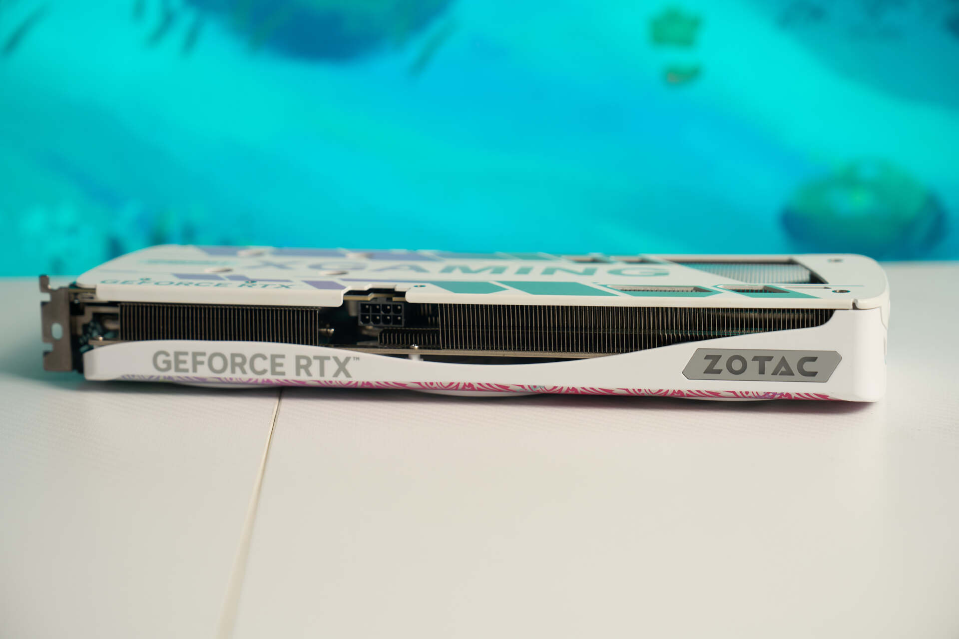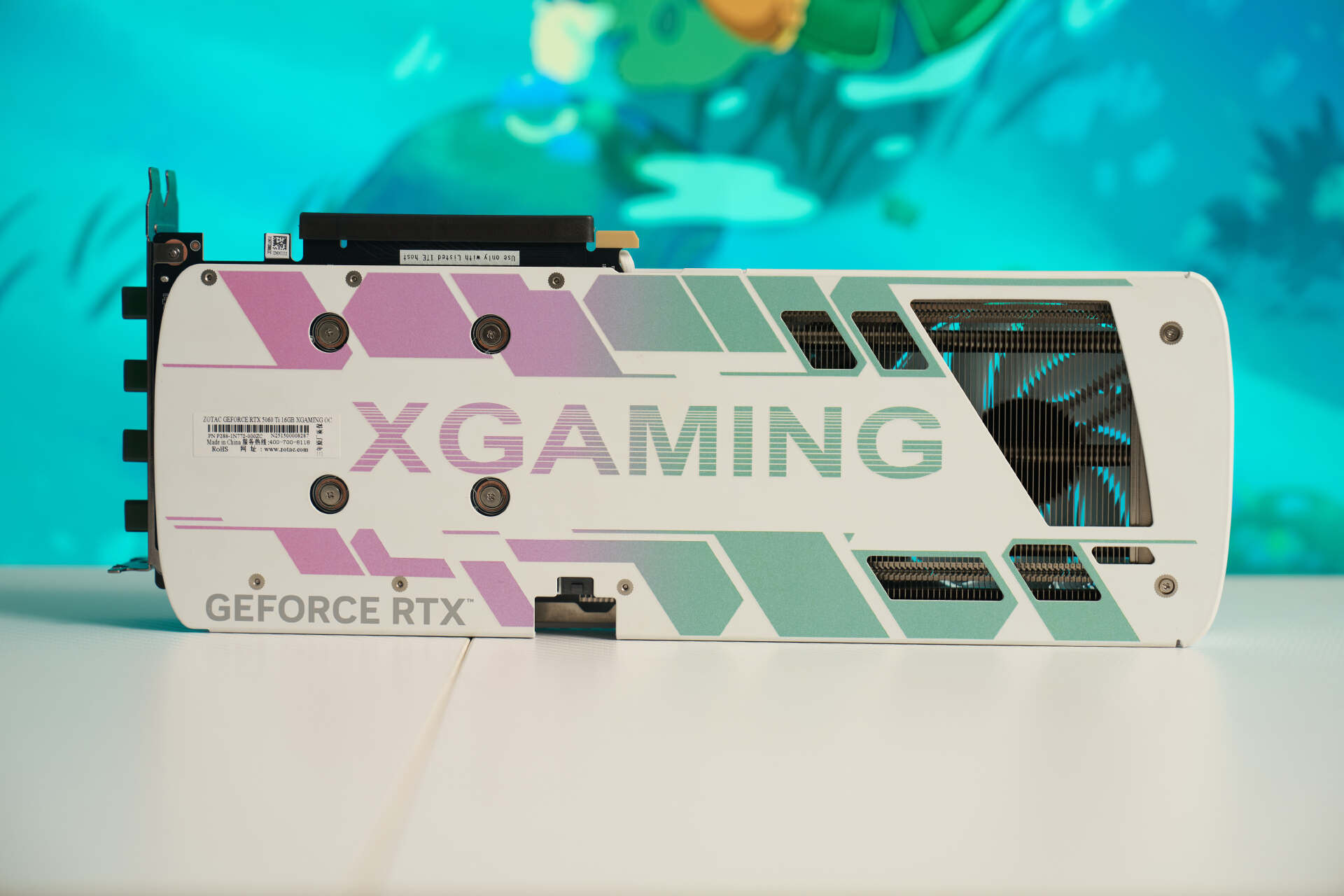 索泰5060TI XGAMING 16G也是有黑色配色的,不过我觉得白色的更好看,外观还是继承了索泰XGAMING系列标志性的珠光变彩外壳搭配青紫色渐变的图案,极为吸睛。