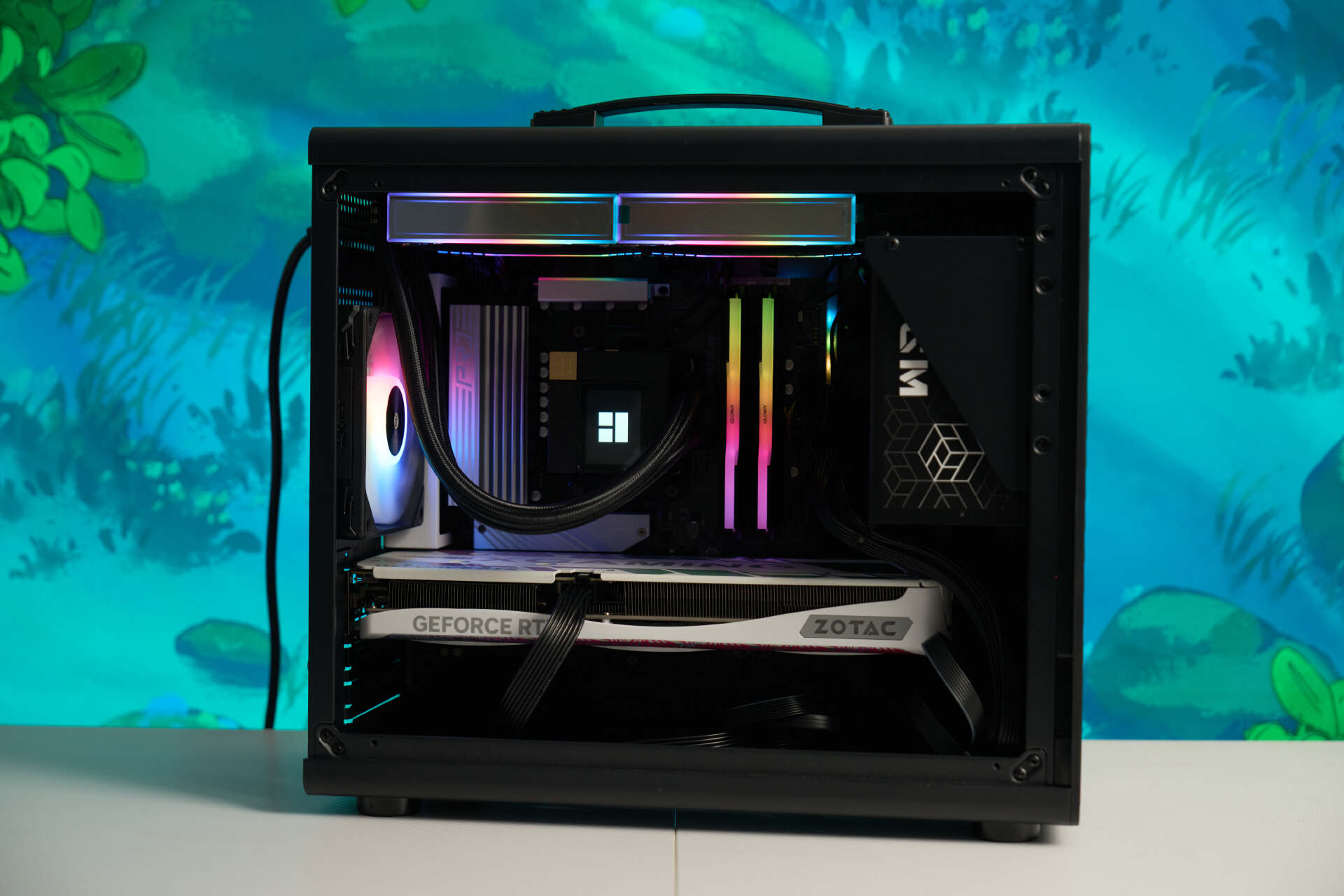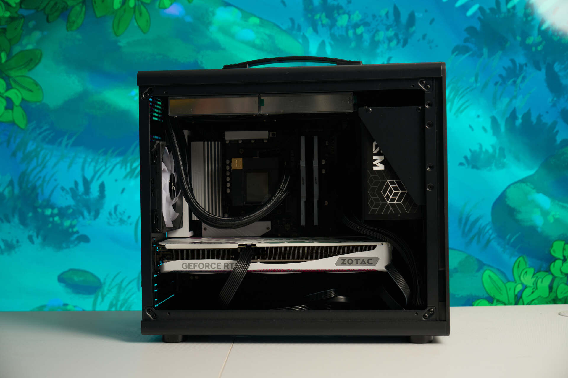 240水冷安装在顶部,即使搭配ATX电源也没什么问题,利民CORE MATRIX 240水冷自带的风扇效果还是不错的。