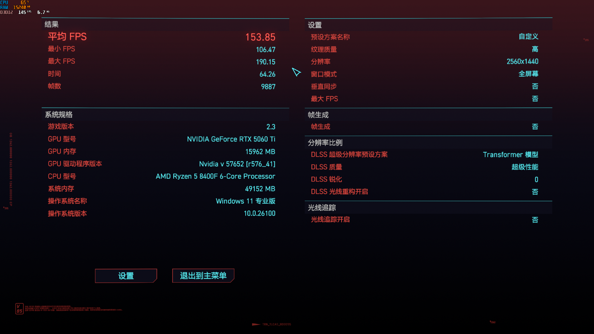 2077可以开启DLSS4,那必须开DLSS测试,平均帧154.8帧,1%LOW88.8帧,开启DLSS4的提升是巨大的,NV就是硬。