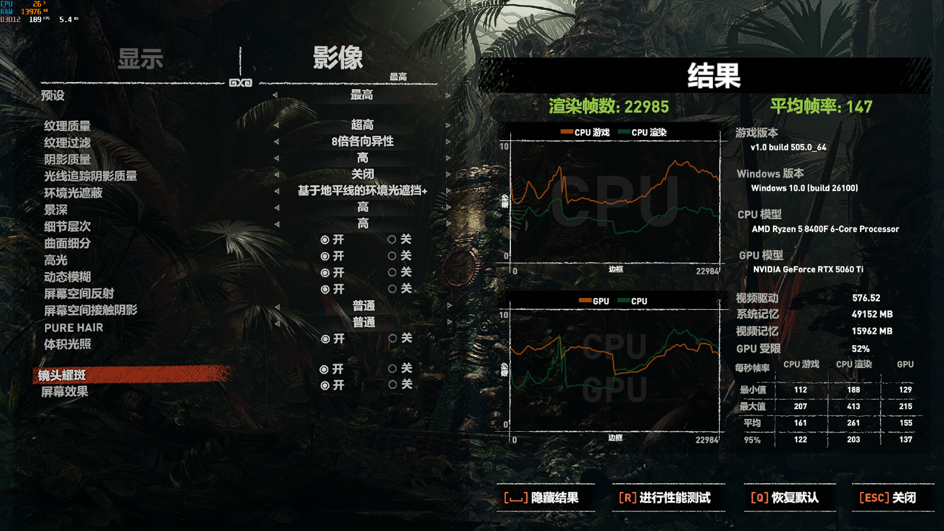 到了3A游戏,三缓就没那么重要了,我们来看看古墓丽影暗影的测试结果,平均帧149.3帧,1%LOW103.8帧,总体来说这种游戏只需要满足60帧就可以了,无需超级高的帧数,8400F在玩3A游戏还是没什么问题的。