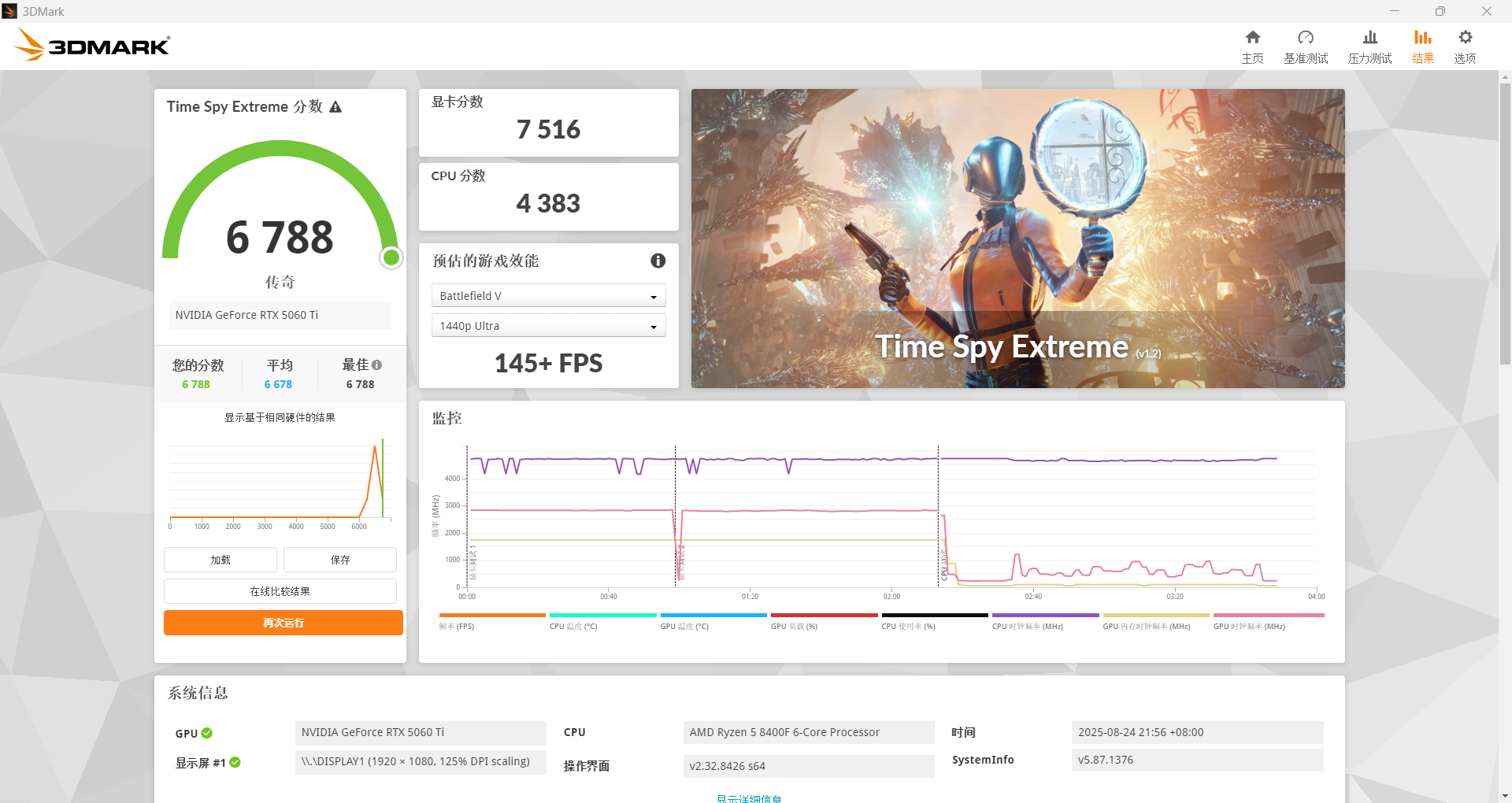 在TSE里,显卡分数为7516分,CPU分数为4383分。