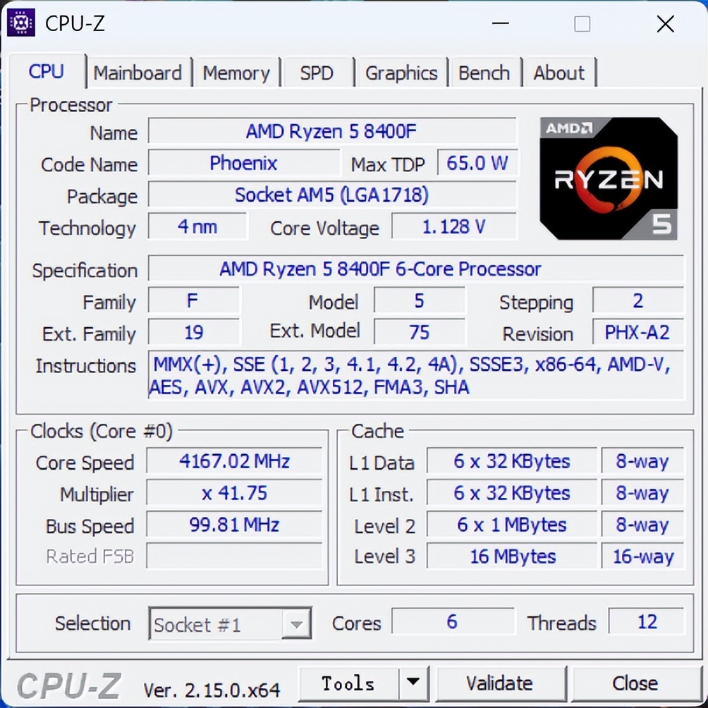 首先看下CPU-Z Ryzen 5 8400F,基本没啥问题,6核心12线程。