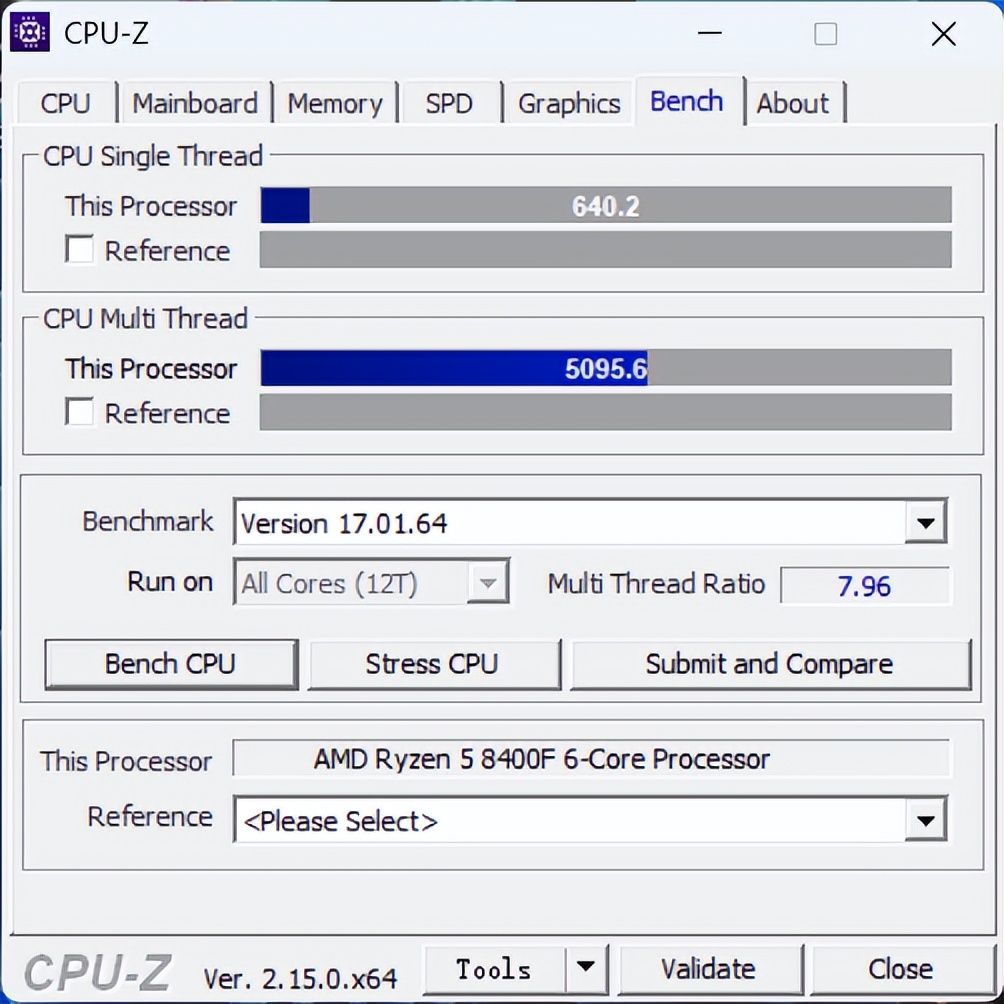 CPU-Z跑分单核640.2,多核5095.6,毕竟是个APU改的,性能不是太强。