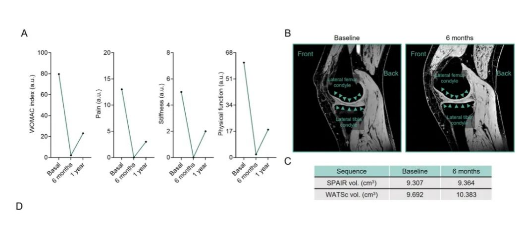 在本次研究中,一名56岁的膝骨关节炎(OA)患者接受了单次关节腔内脐带间充质干细胞外泌体注射,注射剂量为2×10¹⁰个外泌体。经过12个月的随访,结果显示: