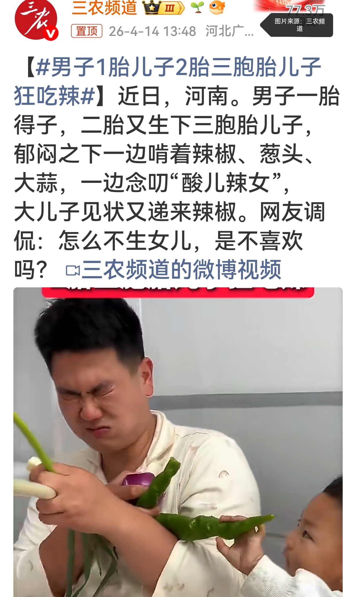 近日,河南一位爸爸意外走红网络。他第一胎生下一个儿子,本想着二胎能凑个“好”字,圆了女儿梦,没想到二胎直接来了三胞胎儿子。看着家里四个男孩,这位爸爸彻底无奈又崩溃,直接坐在桌边狂啃辣椒、葱头、大蒜,嘴里还不停念叨“酸儿辣女”,结果大儿子看到后,还贴心地又递上一根辣椒,画面又心酸又好笑。视频一出,立刻引来大量网友围观调侃,不少人笑称:“怎么不生女儿,是不喜欢吗?”