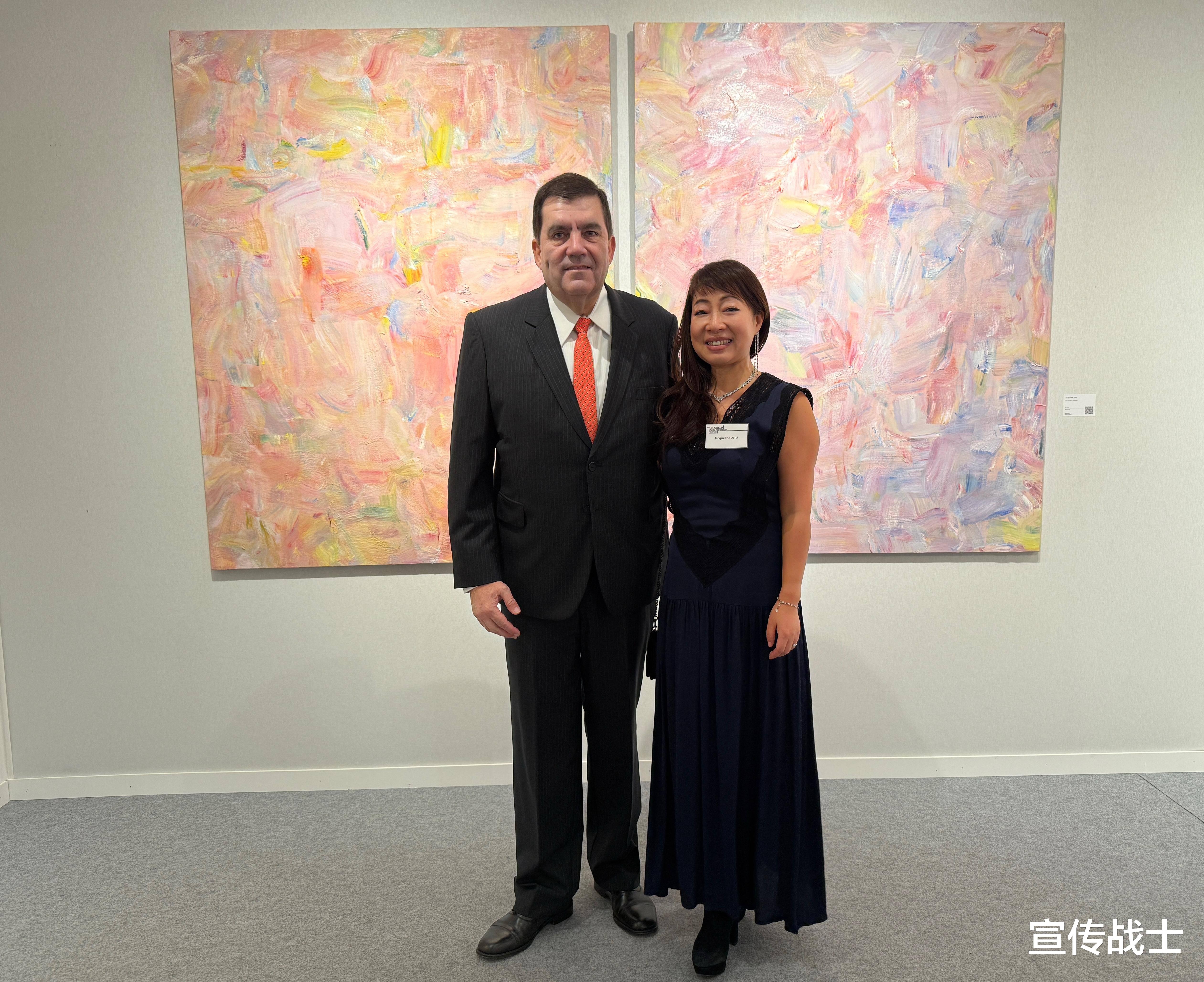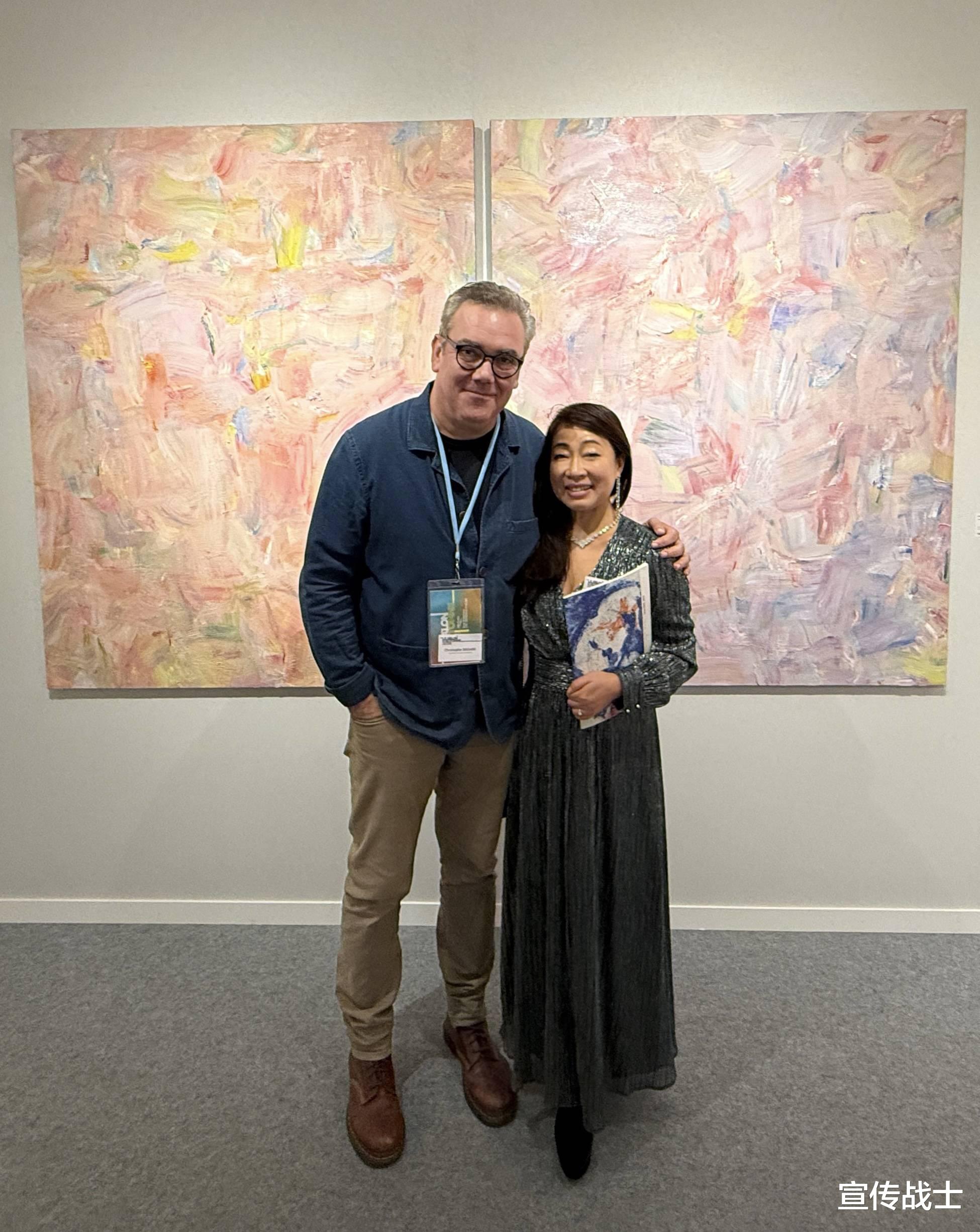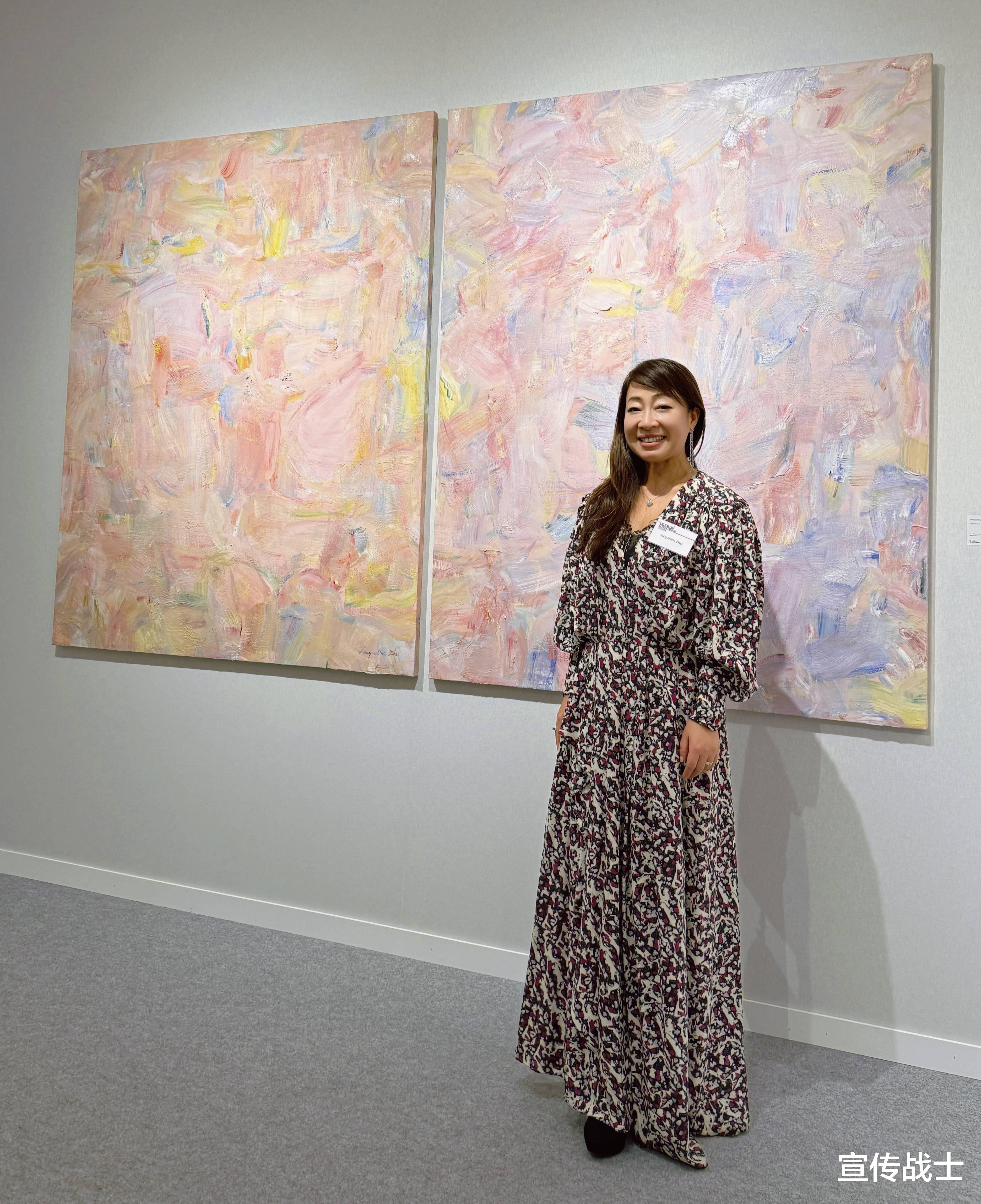 朱林静此次参展的油画作品《Les travaux d'amour》(爱的劳作),尺幅为162x260厘米的双联画,陈列于“一号馆抽象艺术Abstraction “ B04展位。作品凭借其深邃的哲学思辨与细腻的情感表达,在展期内吸引了各国艺术评论家与观众的广泛关注,获得一致好评。