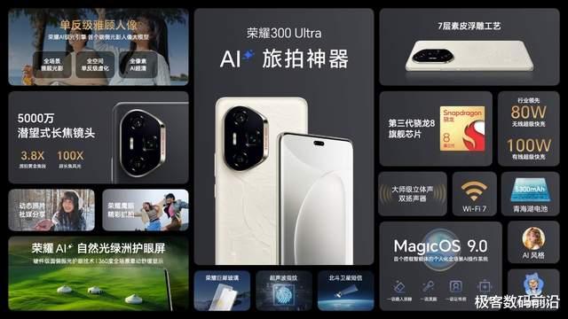 同时还创新荣耀AI驭光引擎,打造大师级单反人像;首发“赛博晕车贴”防晕车功能,还有“电子叶黄素”护眼屏、3D超声波指纹解锁、全系大师级立体声双扬声器、7种国风元素配色、全新“旷野舷窗”DECO设计、6.97毫米超薄机身等重点升级。