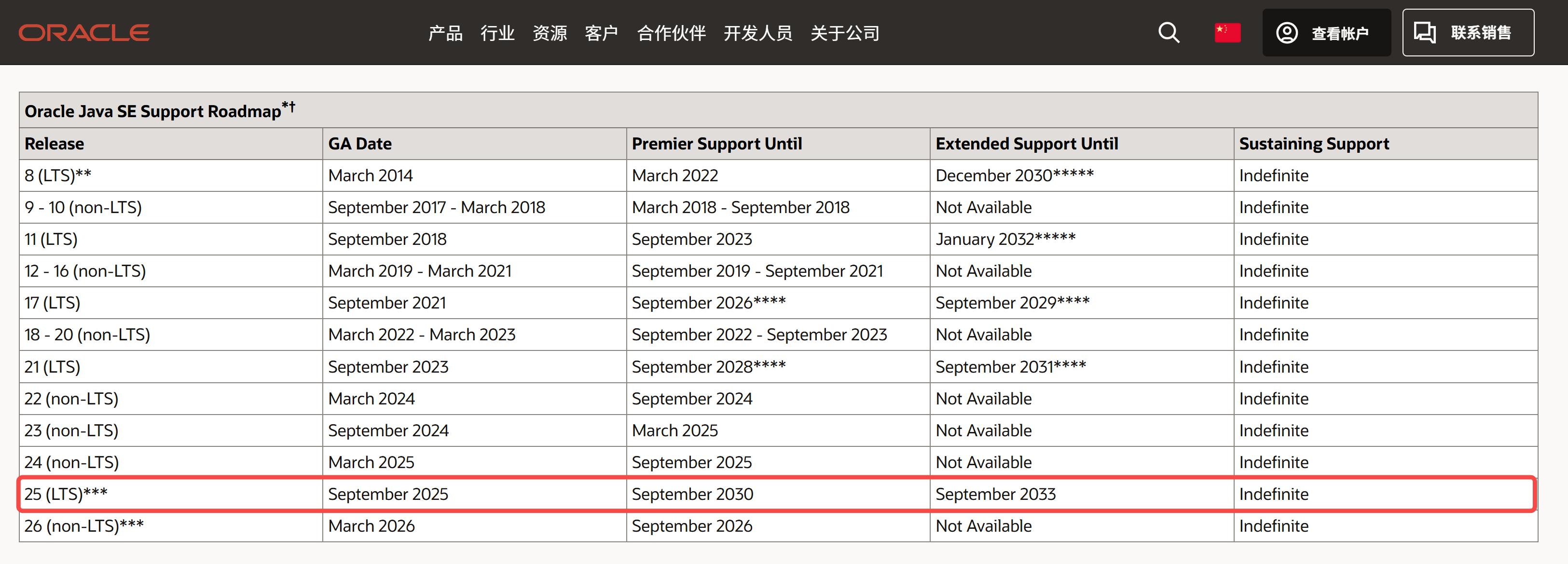 从 Oracle 官网可以看出,最新发布的 Java 25 为长期支持版,并会维护到 2033 年 9 月: