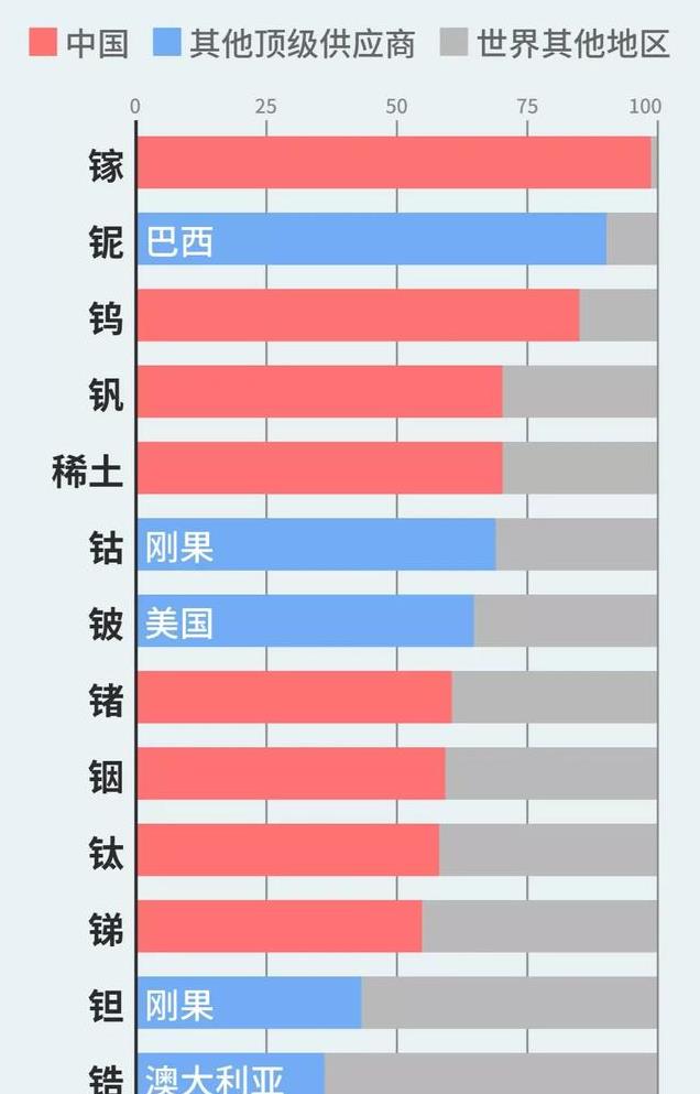 因此不论是基于对等原则,还是为了自身的安全,对美方发起反制都是合理合法的。至于反制的手段,当然是从源头上遏制,毕竟再先进的武器设备都需要应用到某些基本的原始材料。而当今全球的13种重要战争资源中,有8种我国占据了50%以上的产量: