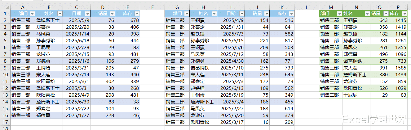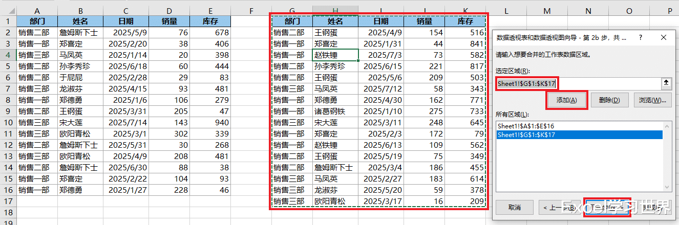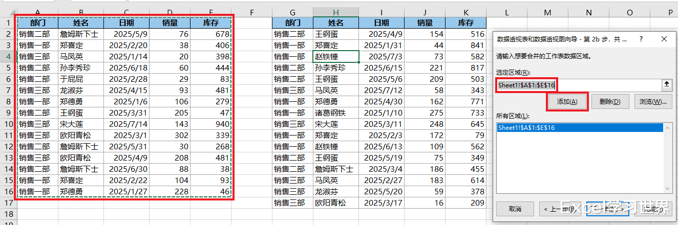 案例:将下图 1 中的两个数据表合并透视,要求计算出各部门每个人的销量和库存之和。