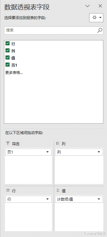 以下是默认的数据透视表。这种方法会将第一列当做“行”区域,其余列都是“值”区域,没法将多列放入“行”区域。
