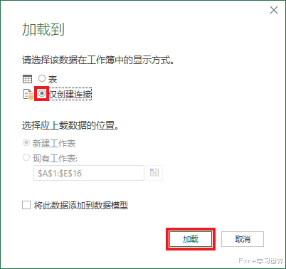 4. 在弹出的对话框中选择“仅创建连接”--> 点击“加载”