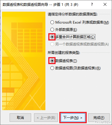 1. 按 Alt+D+P --> 在弹出的对话框中选择“多重合并计算数据区域”和“数据透视表”--> 点击“下一步”