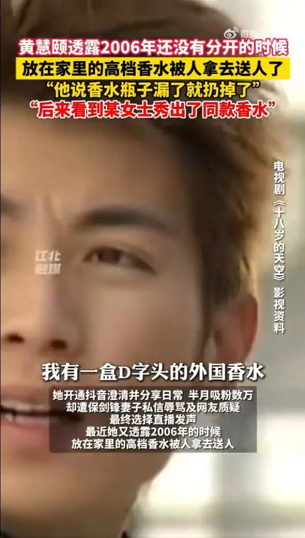 直播中,黄慧颐首度公开了与保剑锋十年恋情中的隐秘细节,其中“香水事件”成为争议核心。她回忆,2006年两人仍处于同居状态时,梳妆台上一瓶未开封的D字头高档香水(网友推测为迪奥)突然失踪。面对质问,保剑锋给出的解释是“香水瓶漏液,已经扔掉了”。