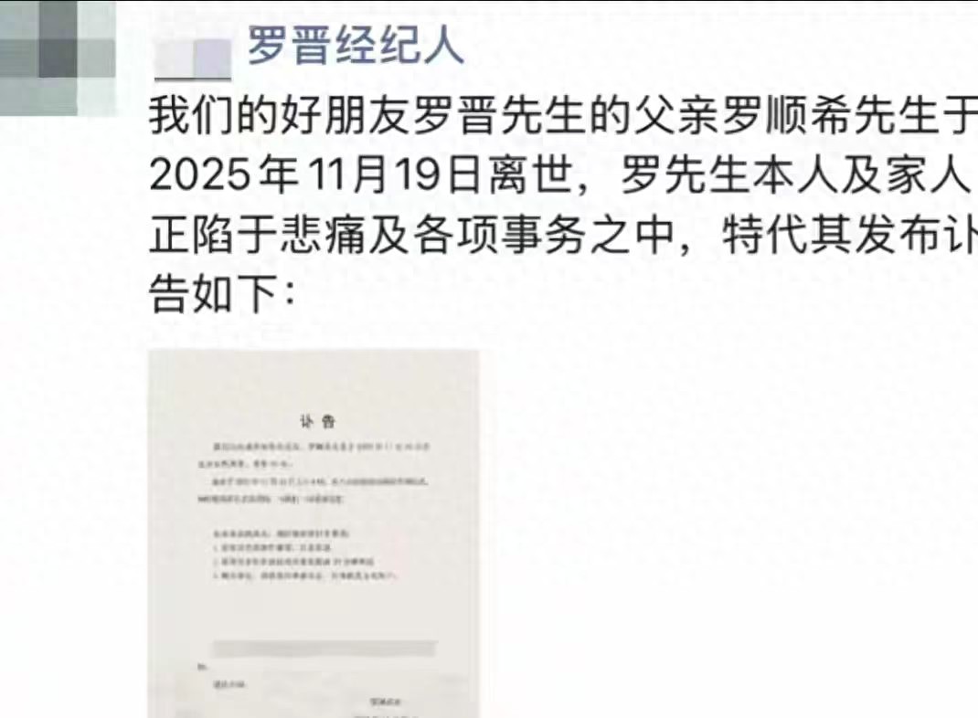 “离婚”还在造谣中,就突然传来罗晋父亲去世的消息,不得不说世事难料啊!罗晋的经纪人代替发讣告,称罗顺希的死对罗晋家人来说打击很大,他们一家人都陷入了悲痛中。