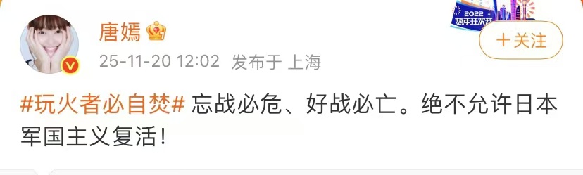 讣告说去世时间是19号,在18号和20号,唐嫣的微博账号一共更新了两条动态,都是跟绝不允许日本军国主义复活有关。IP地址显示一直都是在上海,不知道是不是又工作人员代替发的。