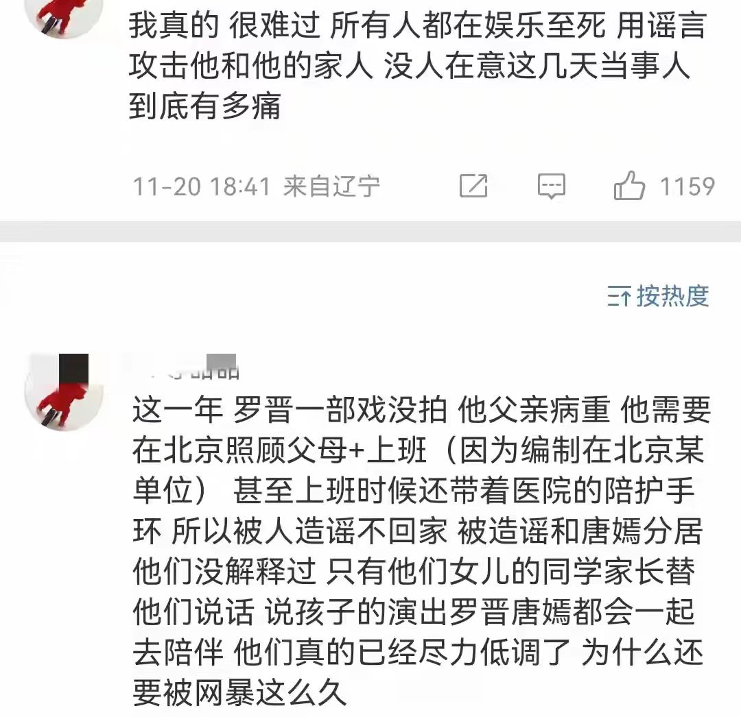 这几天一直在传罗晋和唐嫣分居多年又离婚的事,现在突然曝出罗晋父亲去世的消息。作为知情者之一的大粉实在是忍不住看不下去了,站出来发声,曝光了为什么罗晋跟唐嫣会分居的真相。首先是罗晋的父亲这一年身体都不舒服,罗晋为了照顾父亲已经停了一年不接拍戏,但是他不能不去上班,因为他是有编制的。就算上班也是带着陪护手环,随时都可以知道父亲的情况。罗晋女儿的家长都知道罗晋是一个好父亲,见过他们夫妻俩一起参加学校活动,并不像外界传的那样已经分居。