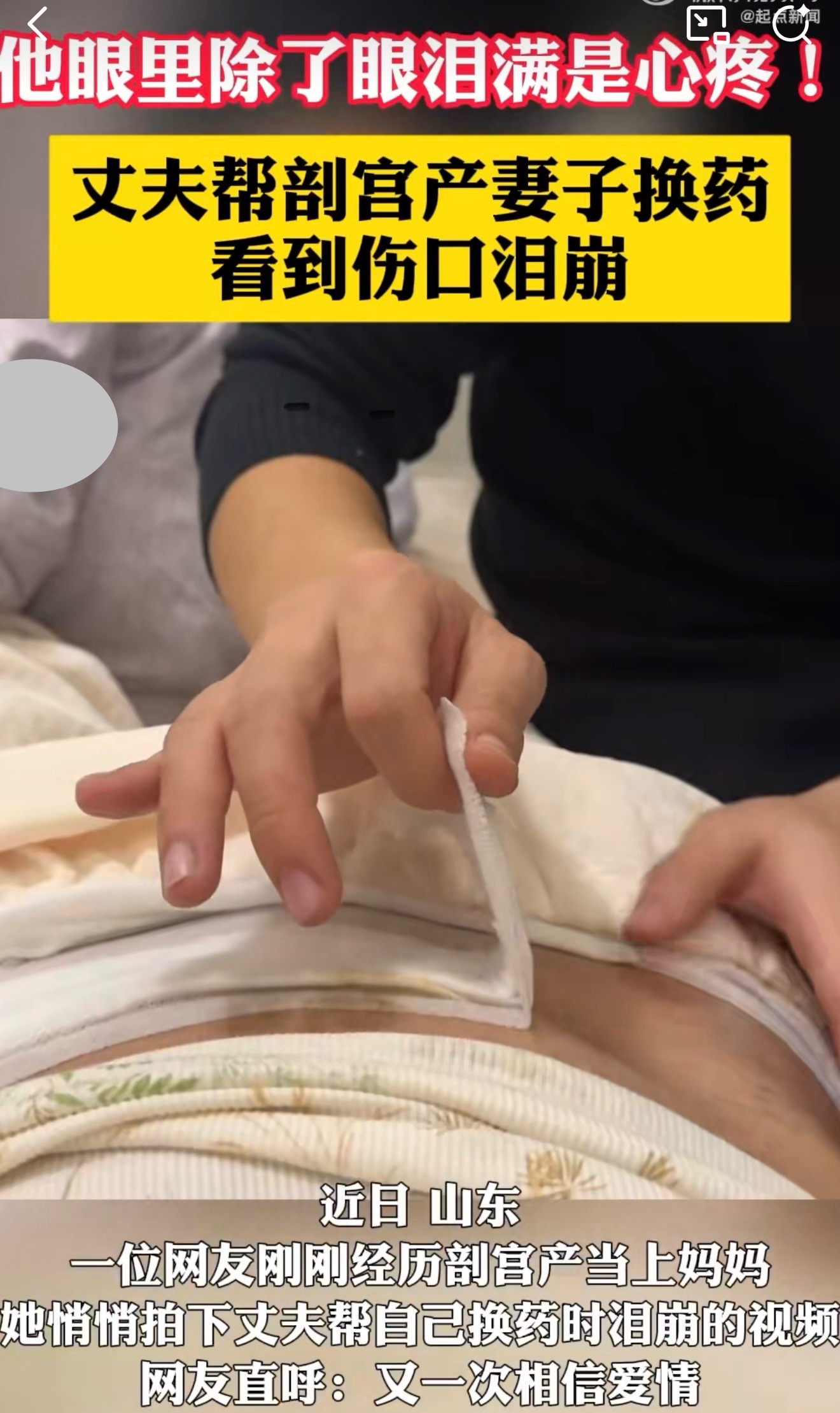 在山东的一个普通家庭里,最近发生了一件让无数网友动容的事。一位刚经历剖宫产成为妈妈的女子,偷偷拍下了丈夫帮她换药时泪崩的视频。视频里,丈夫的动作轻柔得像对待一件易碎的珍宝,他小心翼翼地一点点撕开纱布,每一下都仿佛用尽了全身的力气,生怕弄疼了妻子。当那道剖宫产留下的伤口终于露出来时,这个平日里坚强的大男人,瞬间泪如雨下,泪水止不住地顺着脸颊滑落。