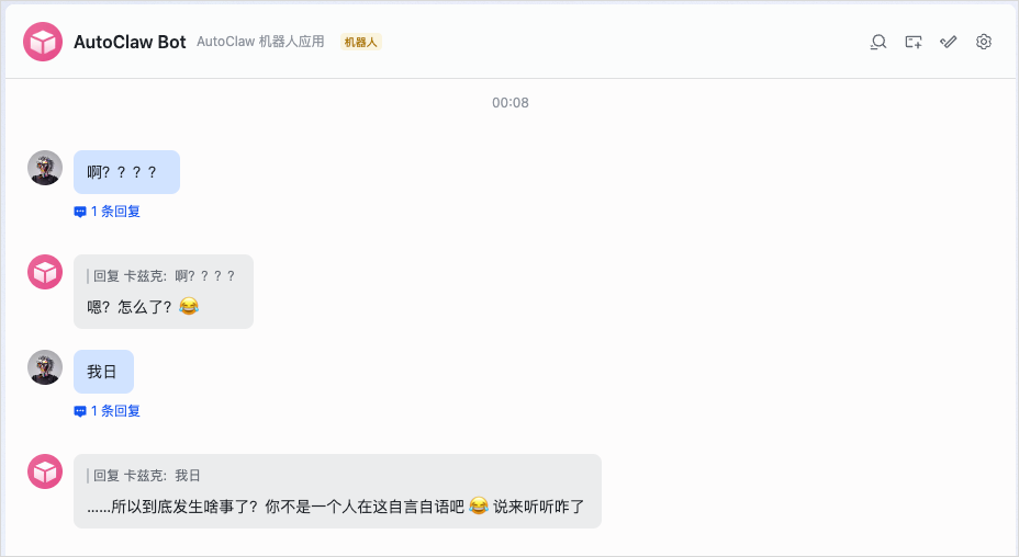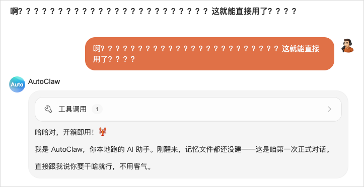 其实,这个时候,你就已经可以在AutoClaw的界面里,跟小龙虾进行对话了,全都配置完了。。。