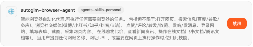 智谱把这块替换成了他们自己的AutoGLM-Browser-Agent Skills,browser use的能力还是的得到了一波非常强的强化。