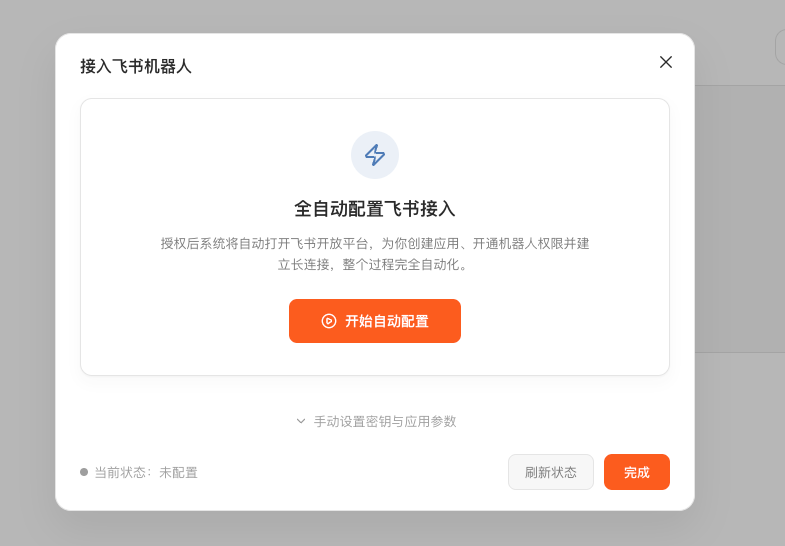 当然,如果你是老玩家,已经有了飞书机器人的参数,你也可以点那个手动设置密钥,自己填一下。