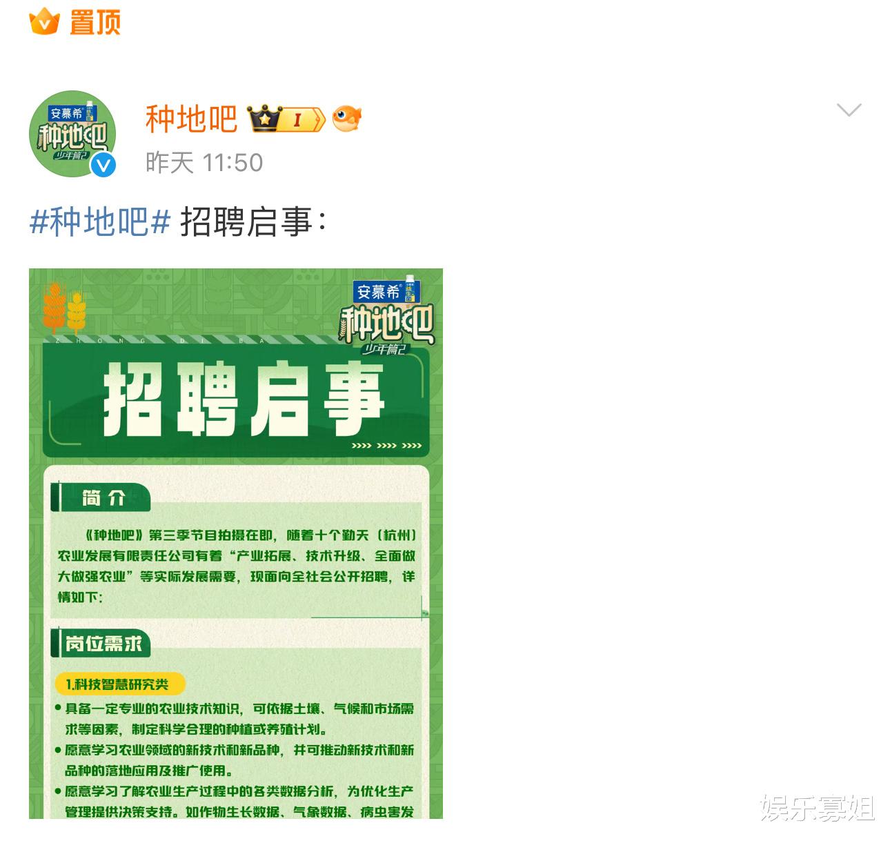 据悉,前几天《种田吧》官博发布招聘信息,粉丝怀疑十个勤天将加人或换人,粉丝强烈表示十个勤天缺一不可,拒绝加人,甚至用取关危险,导致《种田吧》一夜掉几十万粉,后面《种田吧》发长文回忆,有内涵粉丝之嫌,这下粉丝彻底怒了,疯狂的问候节目组和各个社交平台《种田吧》官方账号取关。