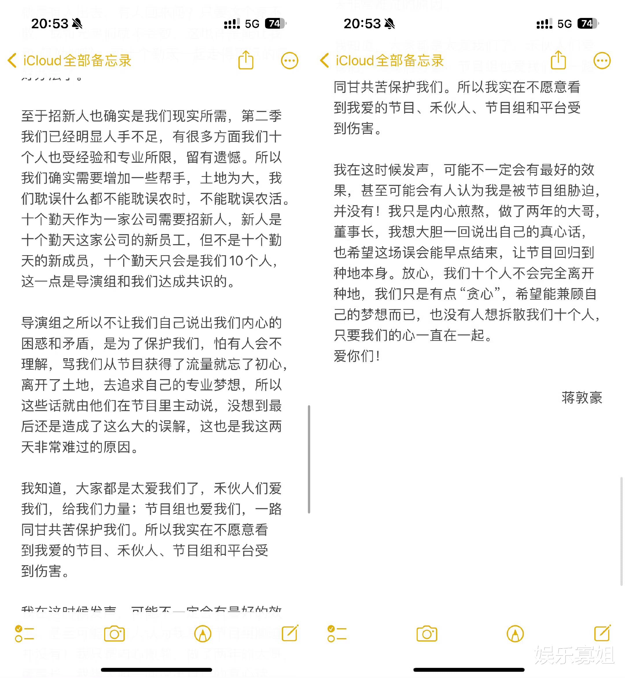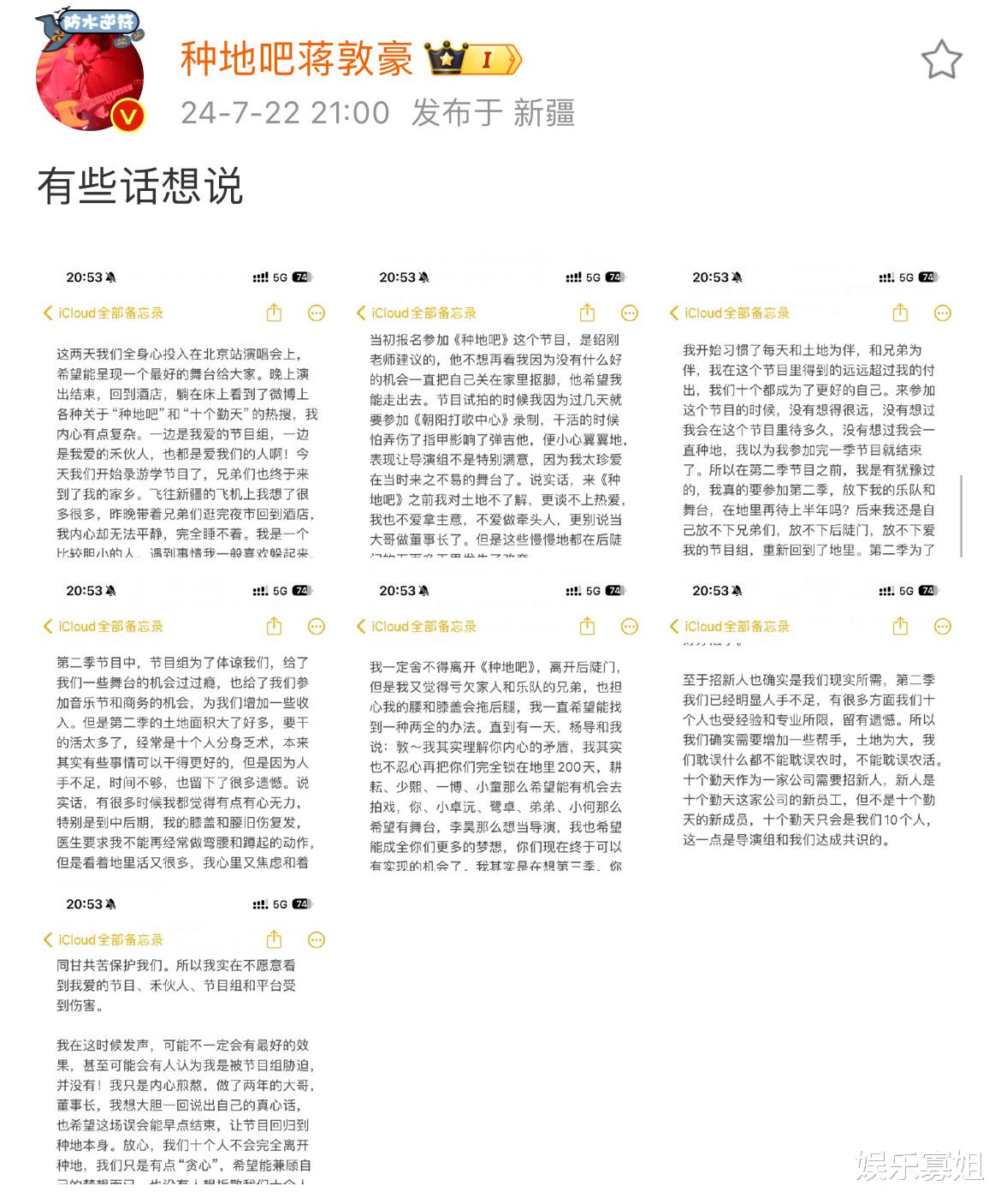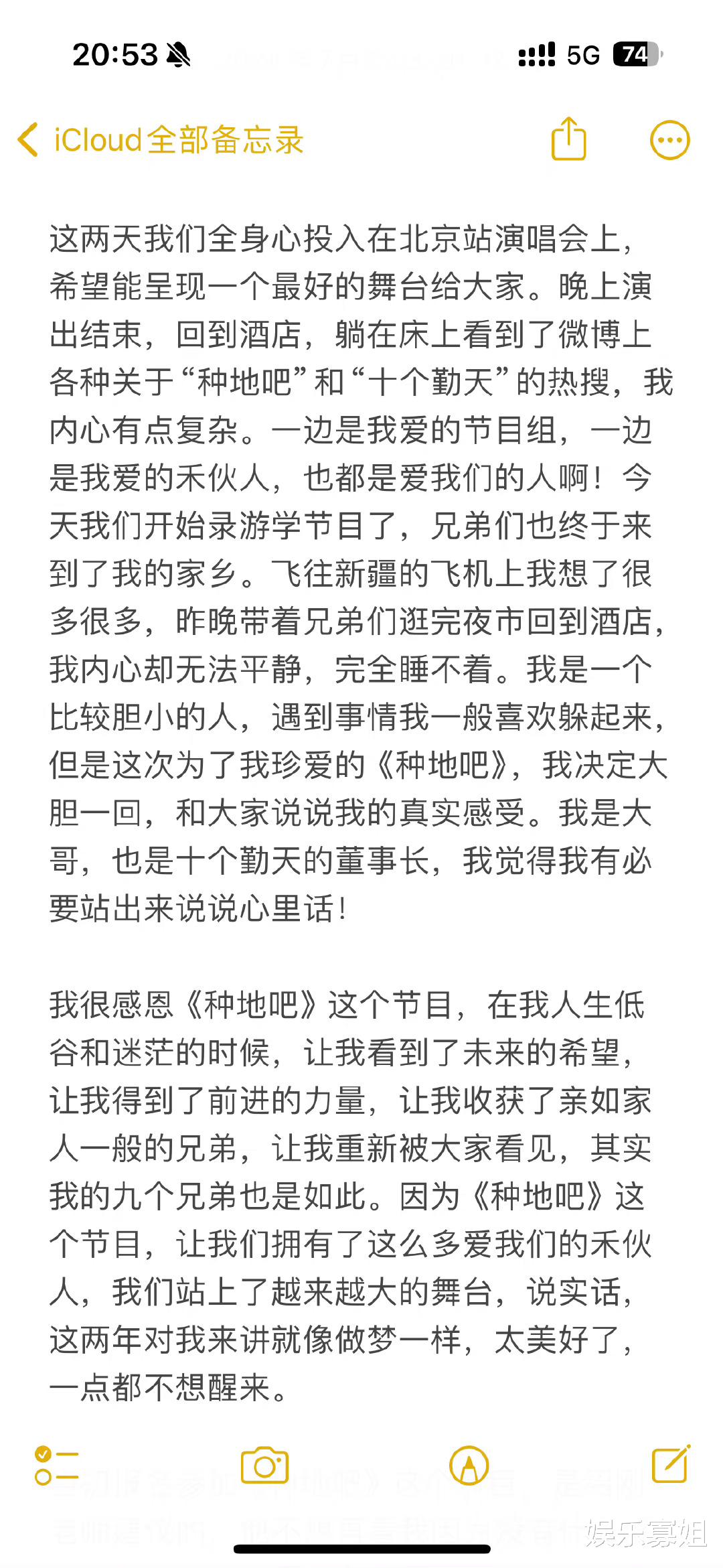 嗨!这里是娱乐寡姐,为你带来最新娱乐资讯。对于近期《种田吧》和粉丝“禾伙人”之间的争议,作为十个勤天大哥蒋敦豪发长文回应,真情实感、推心置腹。向大家解释因为其他工作时间和种地的冲突,大家为了梦想也要兼顾乐队,参加其他综艺,招新是因为人手不足,有很多方面受经验和专业所限,所以需要增加一些帮手。