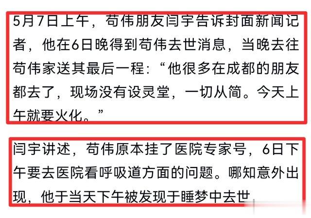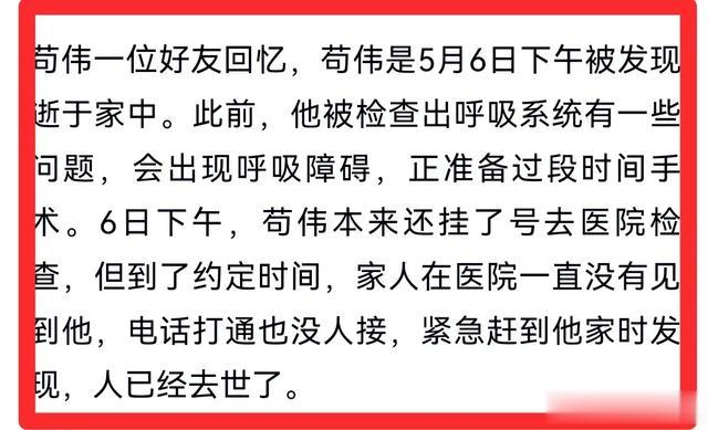 苟伟对此十分重视,去世的当天,苟伟其实是挂了医院的专家号去检查的,他与家人相约医院碰面,但他却未能如约而至,待家人发现时,他已静默倒在了家中,在睡梦中安详离世……