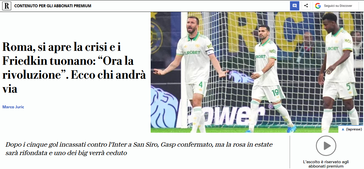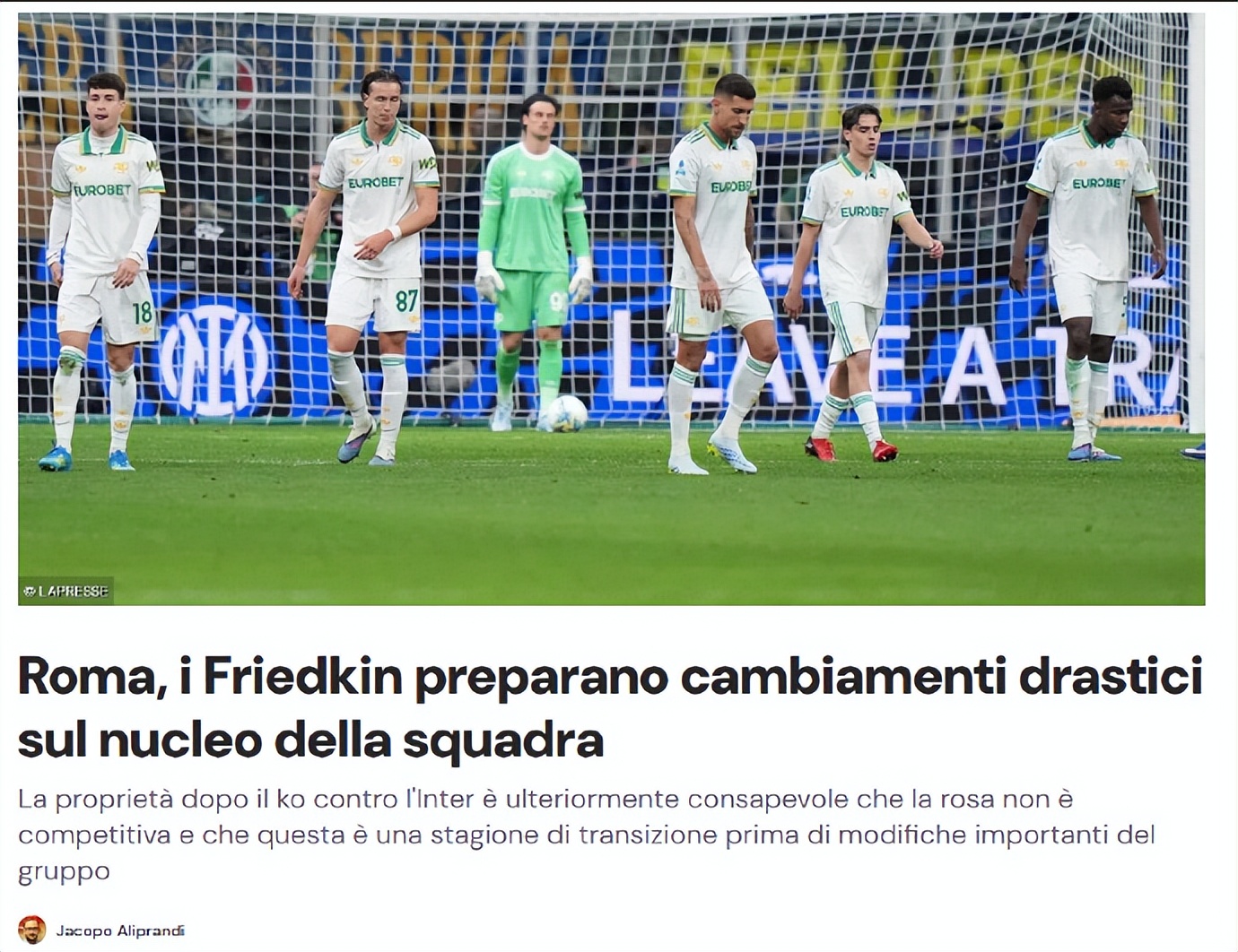 如今加斯佩里尼带队打出八年来的第二佳绩,仍要面临拆队重建的局面,核心球员悉数被摆上货架。演员换了一茬又一茬,教练换了一位又一位,可罗马的剧本始终没变。很明显,弗里德金家族从没正视问题,只是敷衍式重建,他们的终极目标,是建新球场,再次上市,然后套现离场。