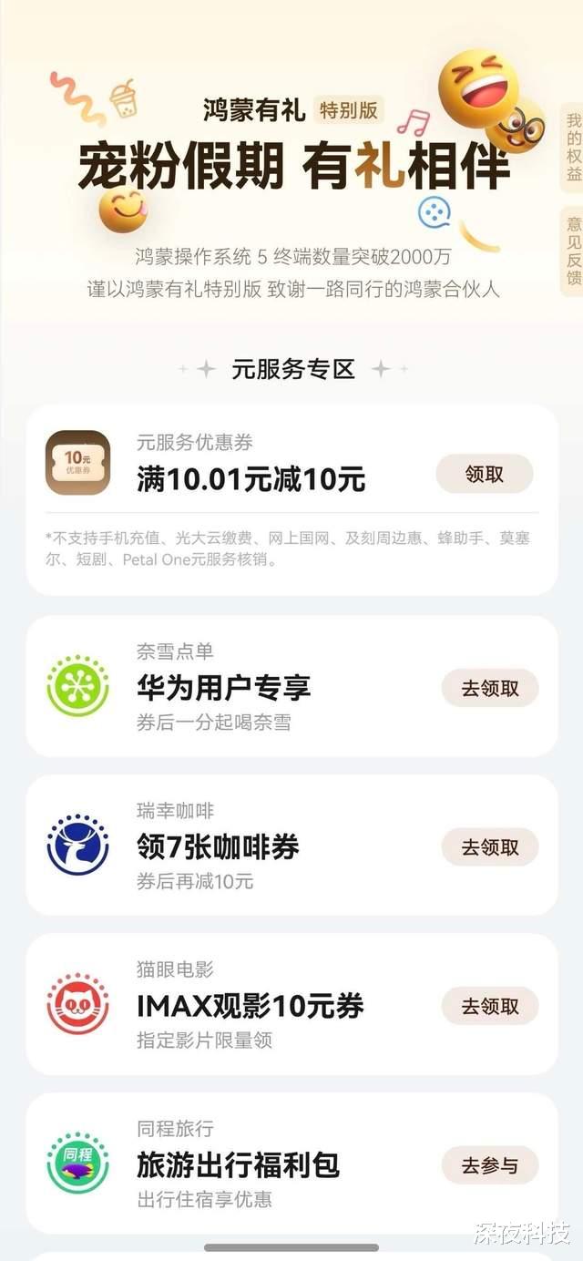可以说,“鸿蒙有礼特别版”活动承包了我国庆假期City walk期间的吃喝玩乐。华为这波宠粉感恩回馈我给满分,升级鸿蒙5的用户快在桌面右滑去负一屏领取福利吧!