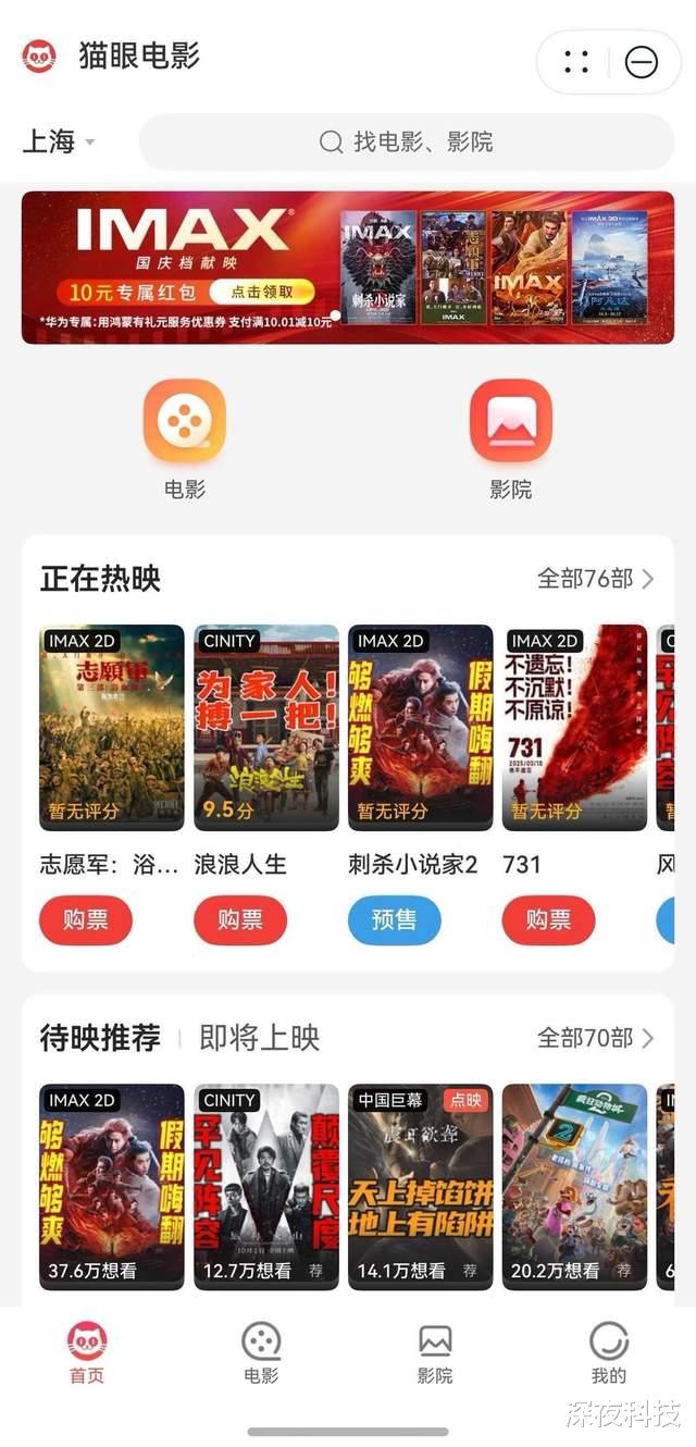 交通出行骑行到了饭点,我也不会亏待自己的胃,直接领取优惠,用美团或者饿了么红包点餐,经济实惠又满足。晚上如果还想看场电影放松一下,猫眼电影的IMAX观影10元券也早已准备就绪。