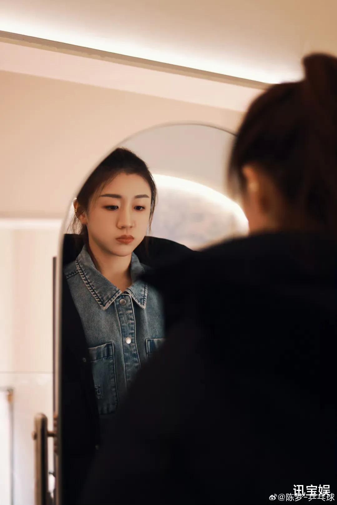 陈梦穿着牛仔外套拍了几组照片后,又特意加上黑色大衣继续凹造型,只见陈梦在镜子面前停驻,眼睛斜视着前方,这造型极具时尚感又不失运动员的飒爽英姿。