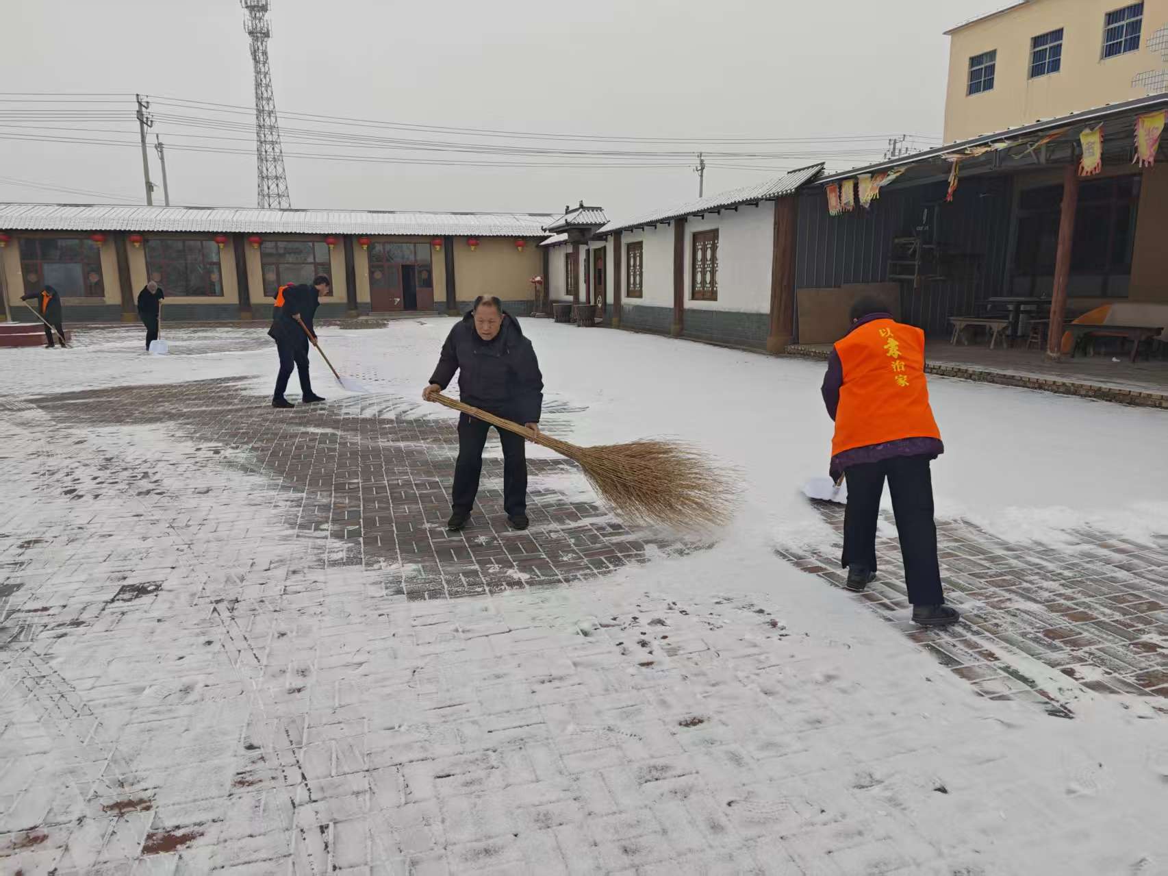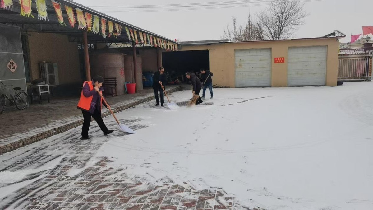 寒风中,义工们和党员干部手持扫帚、铁锹等工具,分工协作、干劲十足。他们穿梭在村内的主干道、小巷胡同以及老年村民聚居区域,奋力清扫路面的积雪与薄冰。大家的额头渗出汗水,呼出的白气氤氲在冷空气中,却丝毫没有放慢手中的动作。经过一番忙碌,村内各条道路的积雪被清理干净,整洁通畅的路面不仅消除了安全隐患,更让冬日的村庄暖意融融。