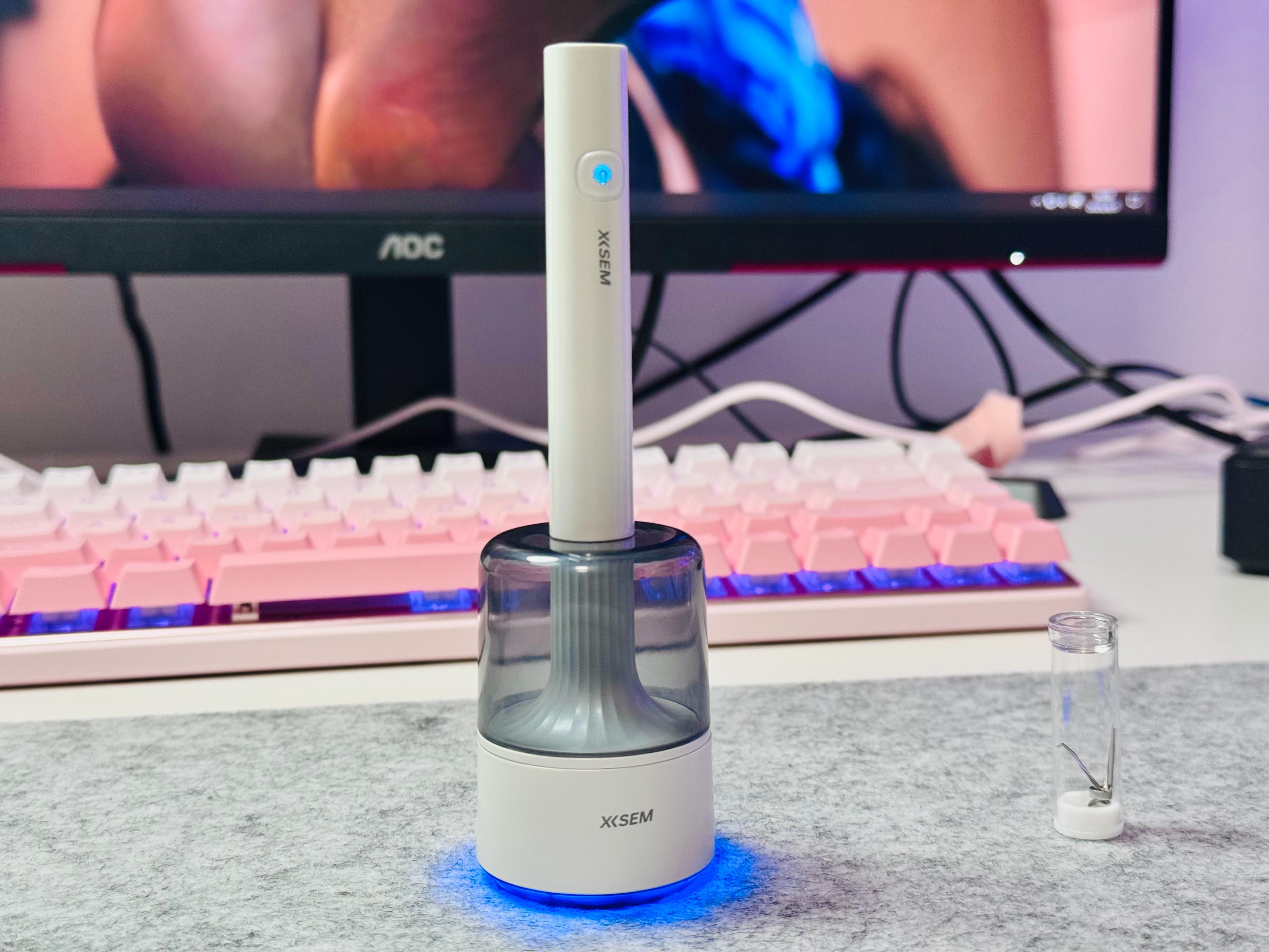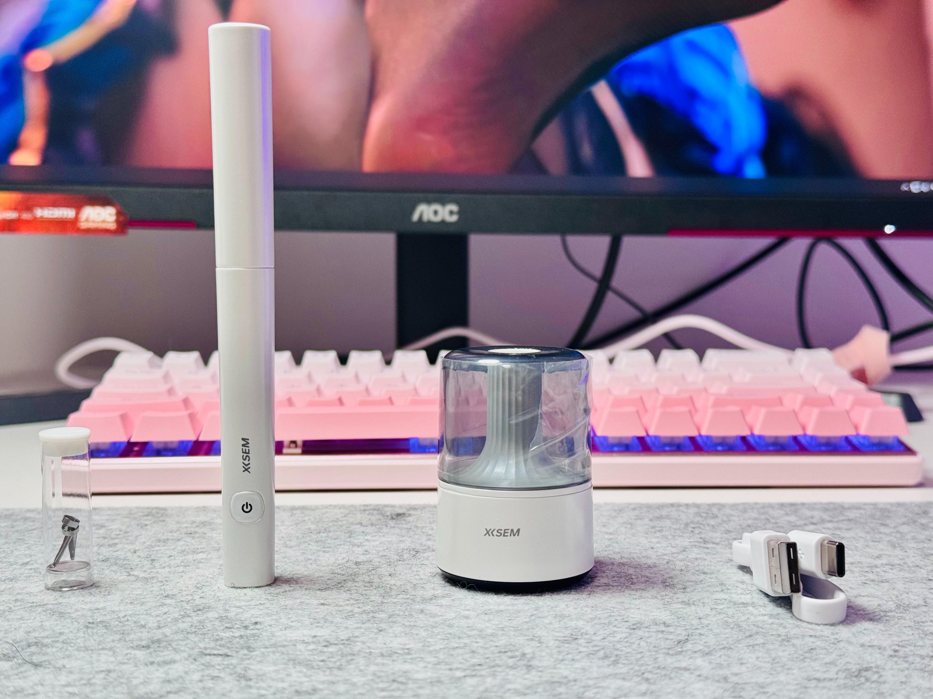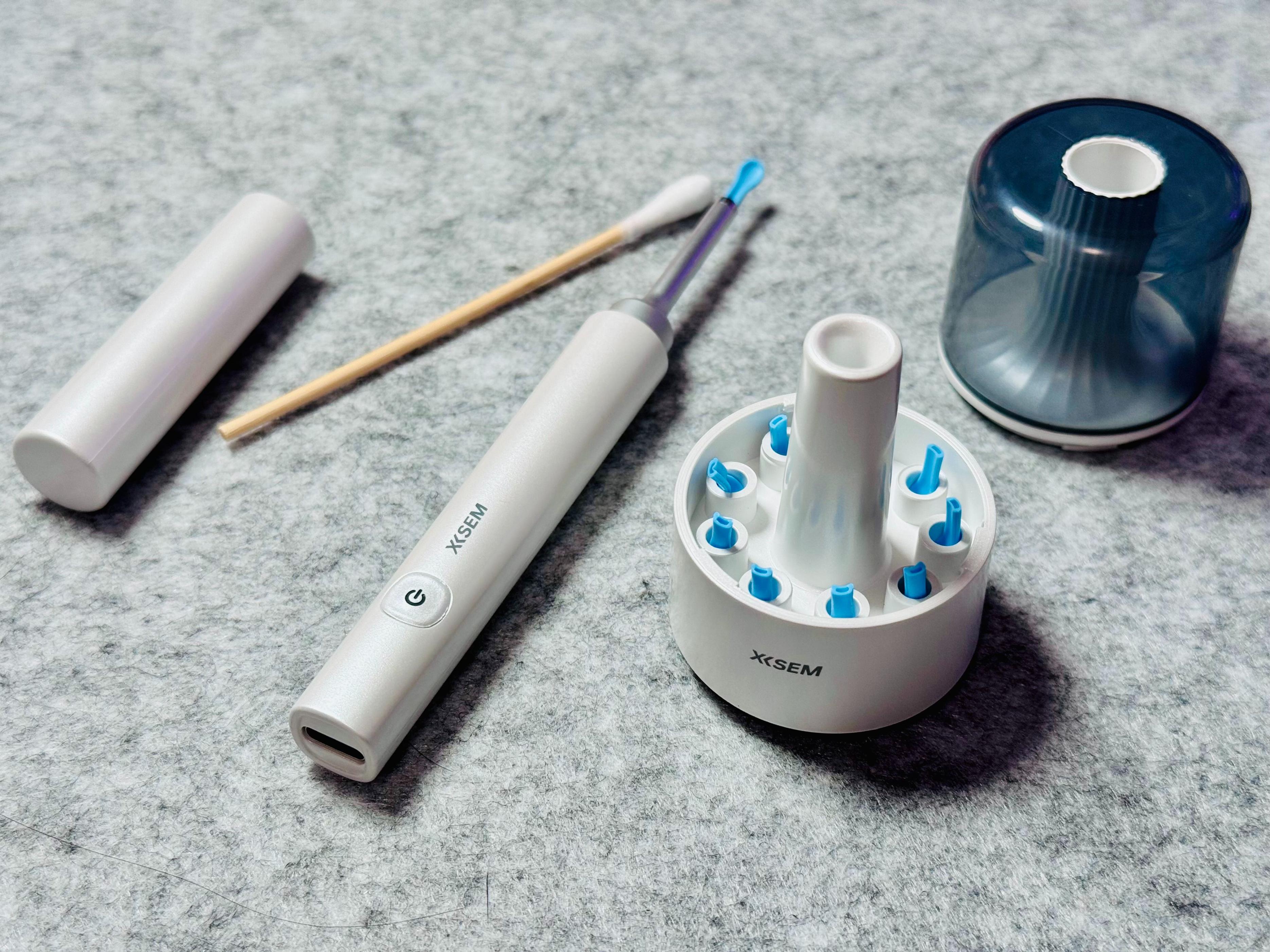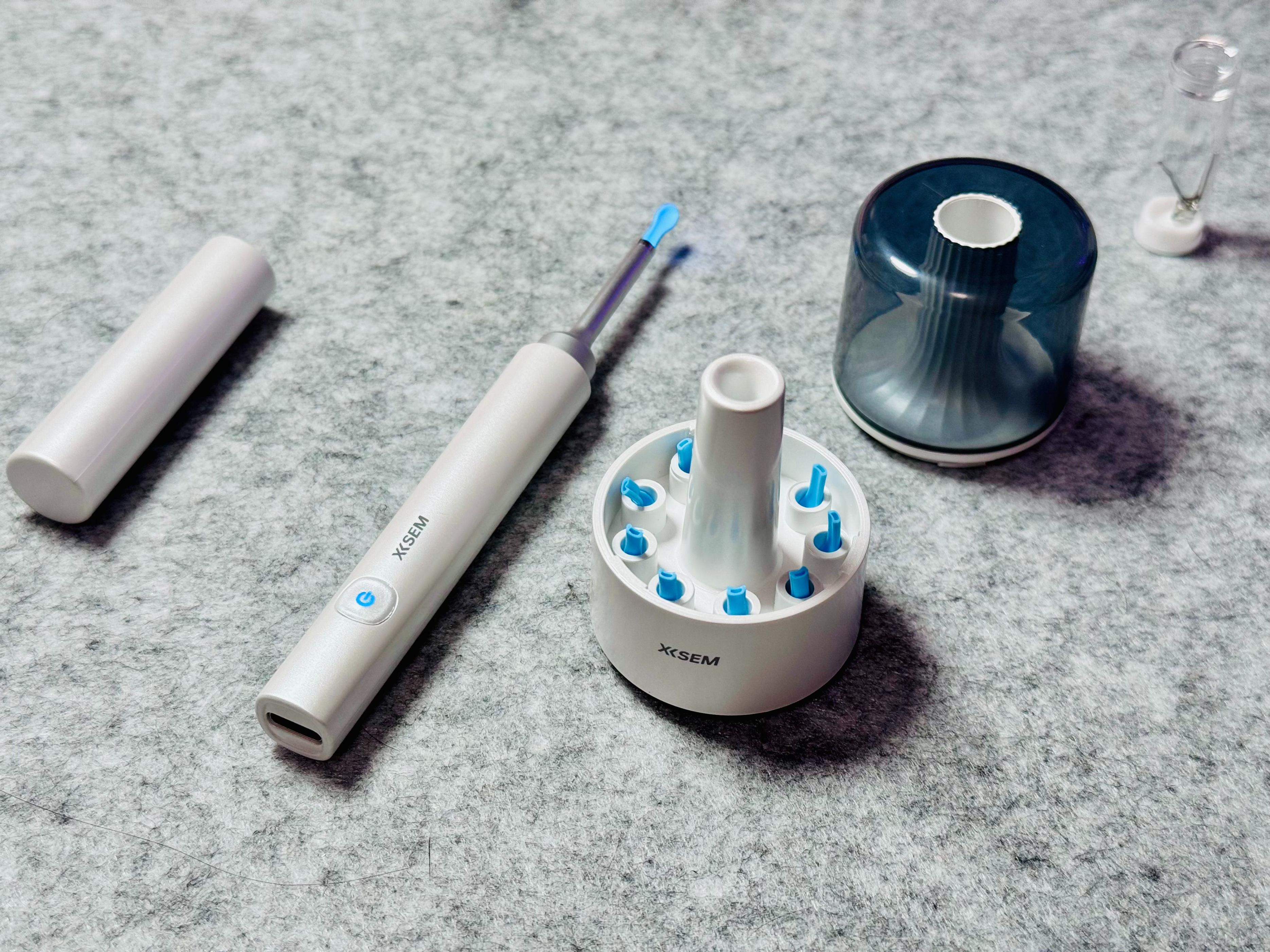 然后挖耳勺本身是珍珠白配色的,整体看上去有点像唇釉,耳勺盖子做了磁吸设计,质感拉满。整个配件包括一根数据线、耳铲头、耳钩头以及UVC消毒底座。