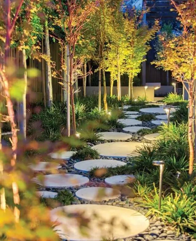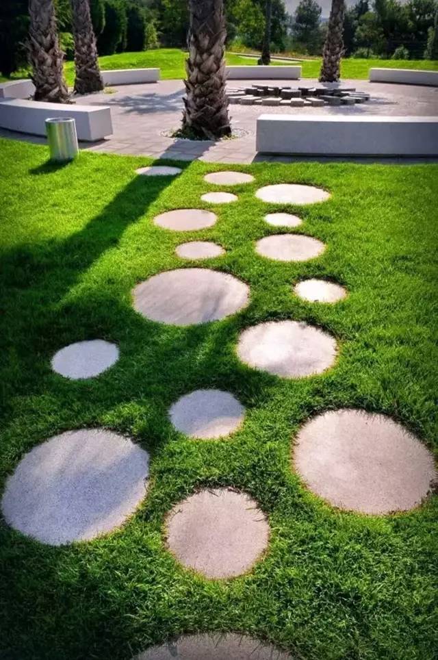 现代汀步的形式不止局限于传统的自然形态,有了更多形式和材质的选择,方形、圆形、椭圆形,石材、木材、金属……