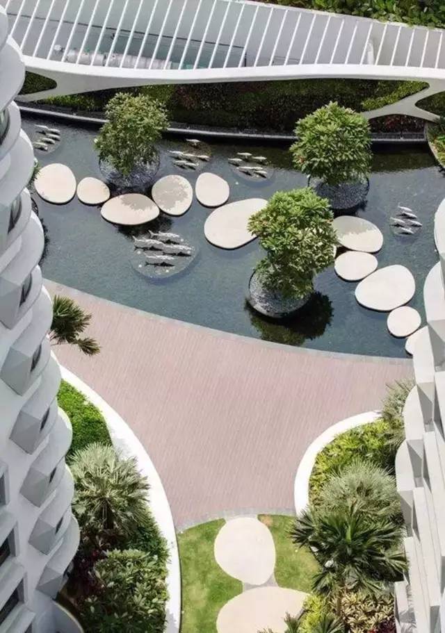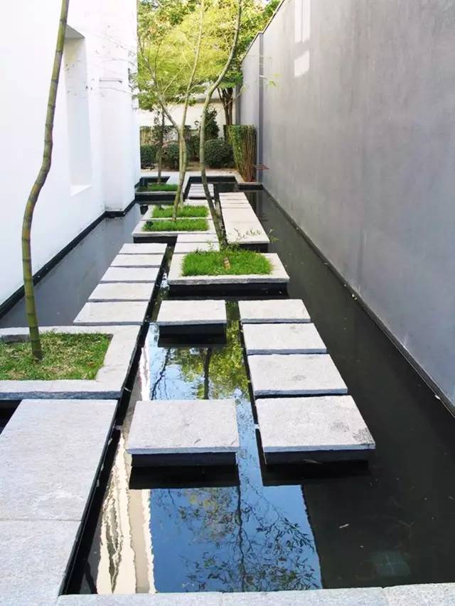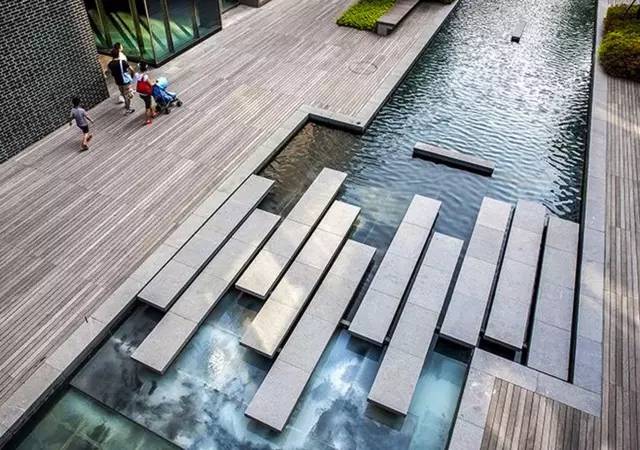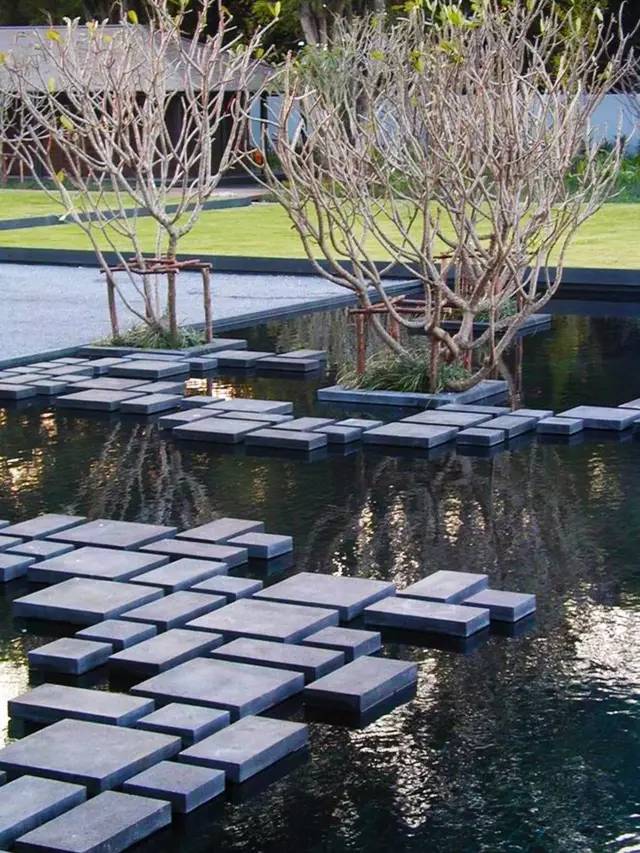 在平静的水面上,汀步或整齐、或规律、或随意的排布着,脚下是潺潺的水流,入眼是庭院之趣,仿佛置身于山间丛林,颇有岁月静好之感。