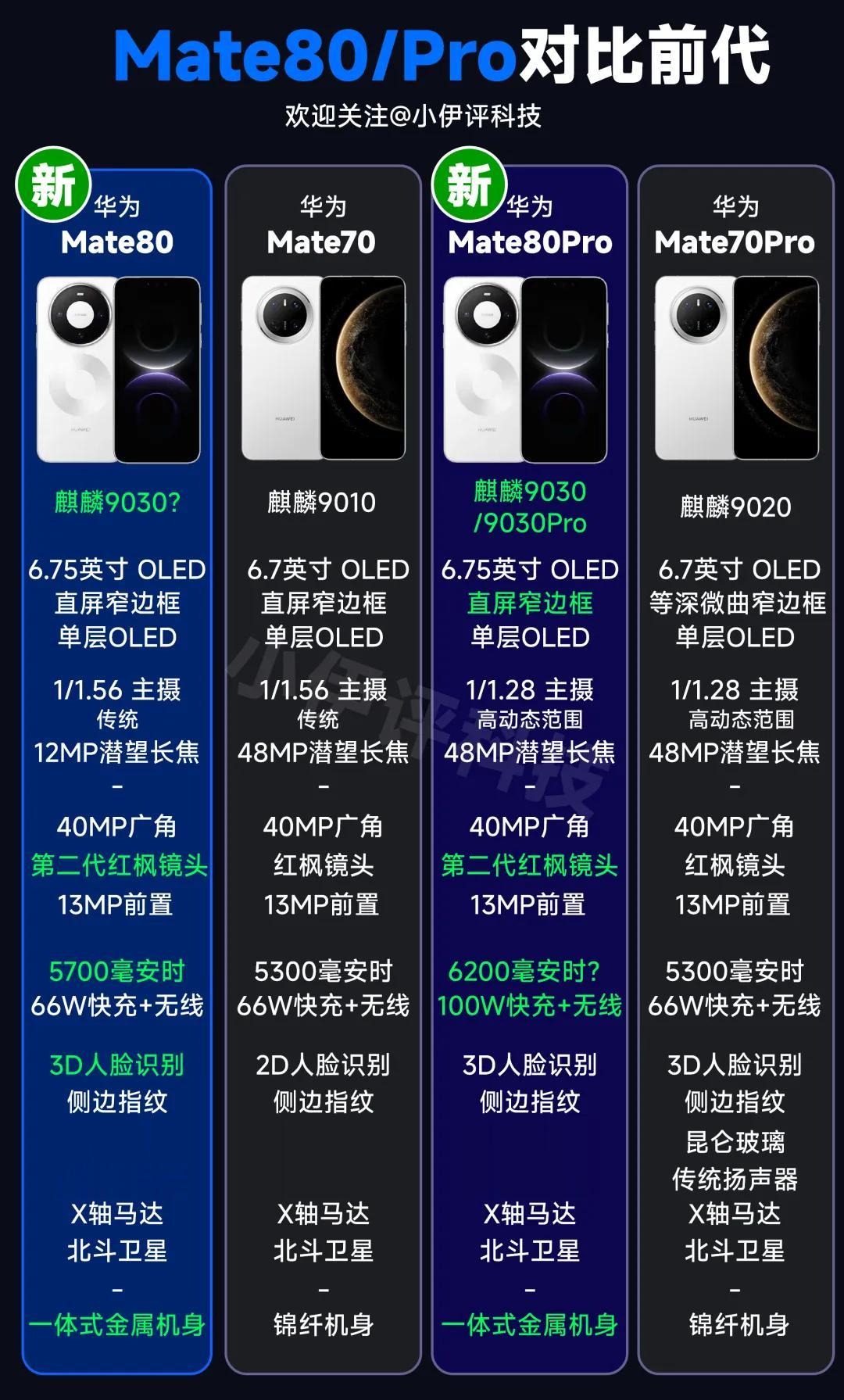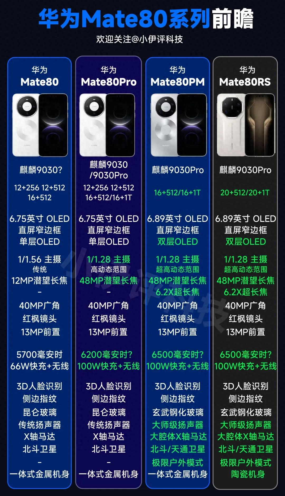 华为Mate80标准版:全系麒麟9030处理器(高准确性),但是也不排除是麒麟9020的可能性,无1TB版本。
