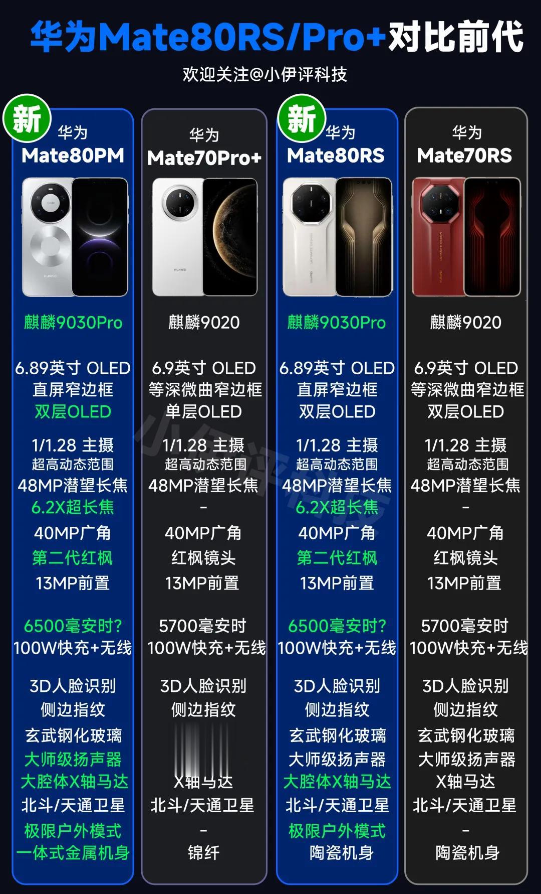 华为Mate80RS:全系麒麟9030Pro处理器,独占20G运存,20+512G起。
