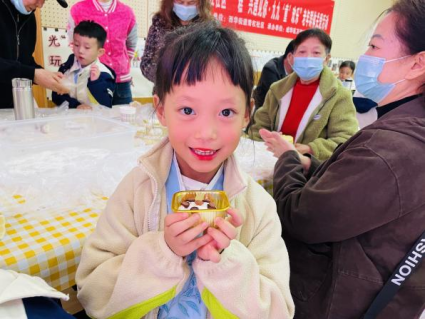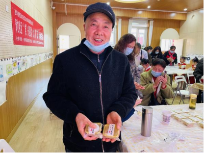 节目表演结束后,活动进入“老少同做重阳糕”环节。老人们与孩子们结成“一对一”结对,在工作人员详细讲解重阳糕的寓意之后,大家共同动手制作。不一会儿,桌子上便摆满了大家的“作品”。孩子们与老人们相互赠送重阳糕,场面十分温馨。