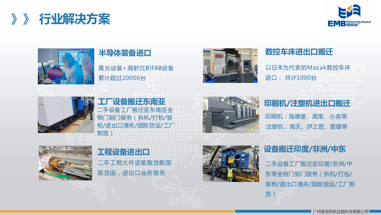 三、您的东南亚出海,我们的“设备护航”对中企而言,设备搬迁不是“物流小事”,而是决定出海成败的 “关键一步”。我们十余年深耕东南亚,见过太多企业因政策不懂、操作不规范 “走弯路”,也帮助很多客户实现“设备安全到岗、合规落地、成本可控”。主攻设备搬迁出口的国家有东南亚、非洲、南美等;搬迁进口回国有日韩、新加坡、台湾、欧美、东南亚国家等。