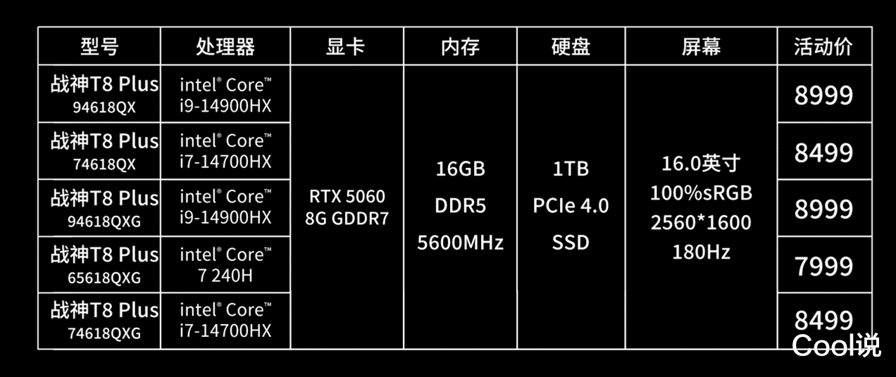 最后,就是人们关心的价格了,酷睿7 240H搭配RTX5060的组合,直接7499元起, 能够参加补贴最低6688元就能拿下,即便是配置最高的i9-14900HX搭配RTX5060的组合最高也就8999元,还是挺香的!所以,近期有选游戏本的打算,真的要看看神舟全新战神T8 Plus,趁着双十一别错过!