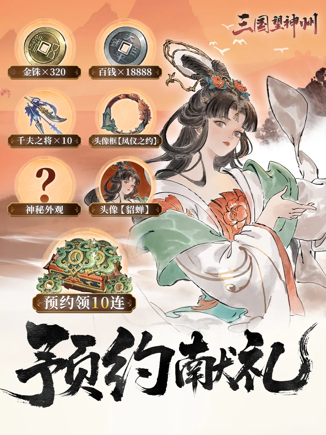 而就在10月23日,这款承载着老三国精神内核与玩家期待的新游——《三国望神州》将正式公测,目前预约通道已全面开启,玩家预约即可解锁凤仪之约头像框、神秘外观、貂蝉头像等丰厚福利,更有预约专属10连抽福利免费领取。