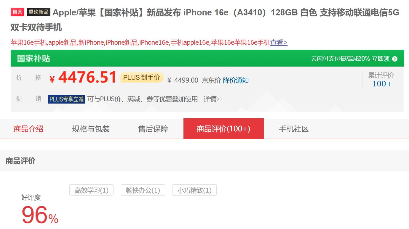 售价方面,iPhone 16e的官方零售价为4499元起,叠加国补500元优惠后,到手价为3999元。