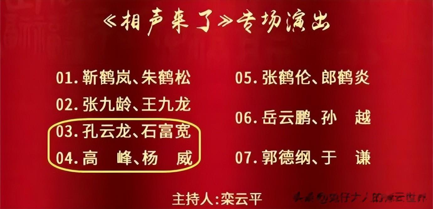 第三场是相声专场,以“相声来了”为主题。其中孔云龙、石富宽,高峰、杨威的节目备受关注。去年纲丝节,孔云龙的个人专场很是出彩,今年师爷石富宽如何应对,大家拭目以待。杨威是天津杨家老大,杨少华的长子。郭德纲邀请杨威登台,网友认为有点意思。这场演出门票还未开售。