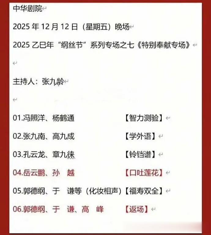 德云社“纲丝节”将在12月8日至14日,在天津中华剧院举办。随着演出近期临近,开幕式、第二天、第三天、第六天、第七天的节目单已经发布。还剩第四天、第五天的节目单等待官宣。这不,网传“纲丝节”第四天、第五天节目单爆火!真假不知,但可以先睹为快。