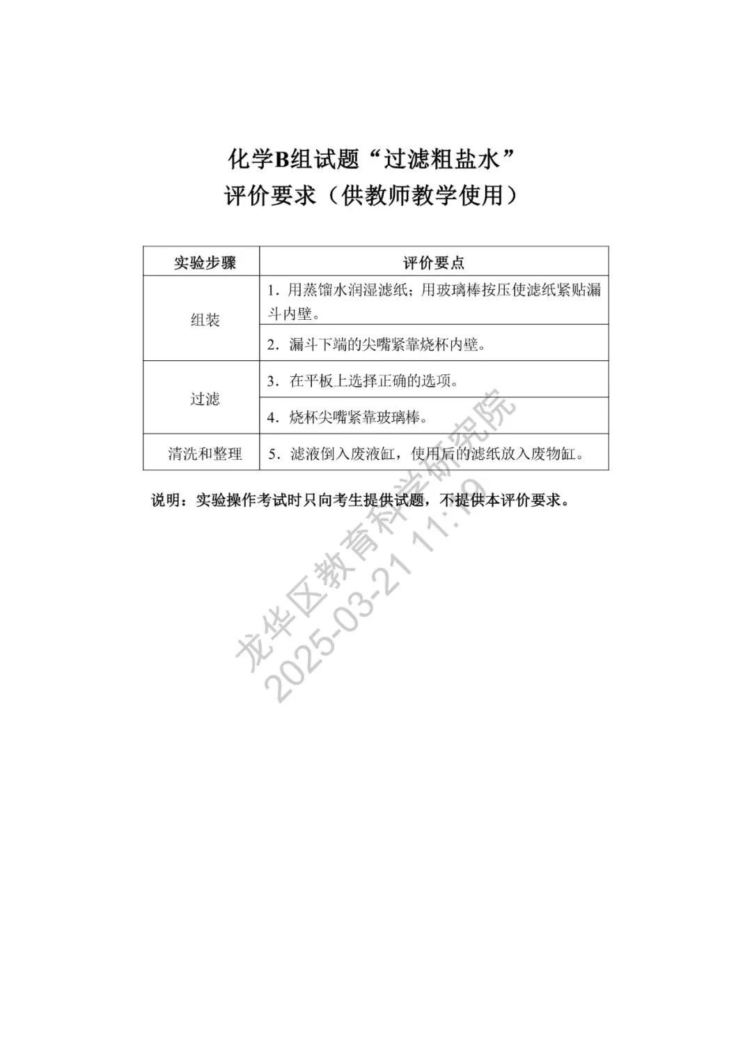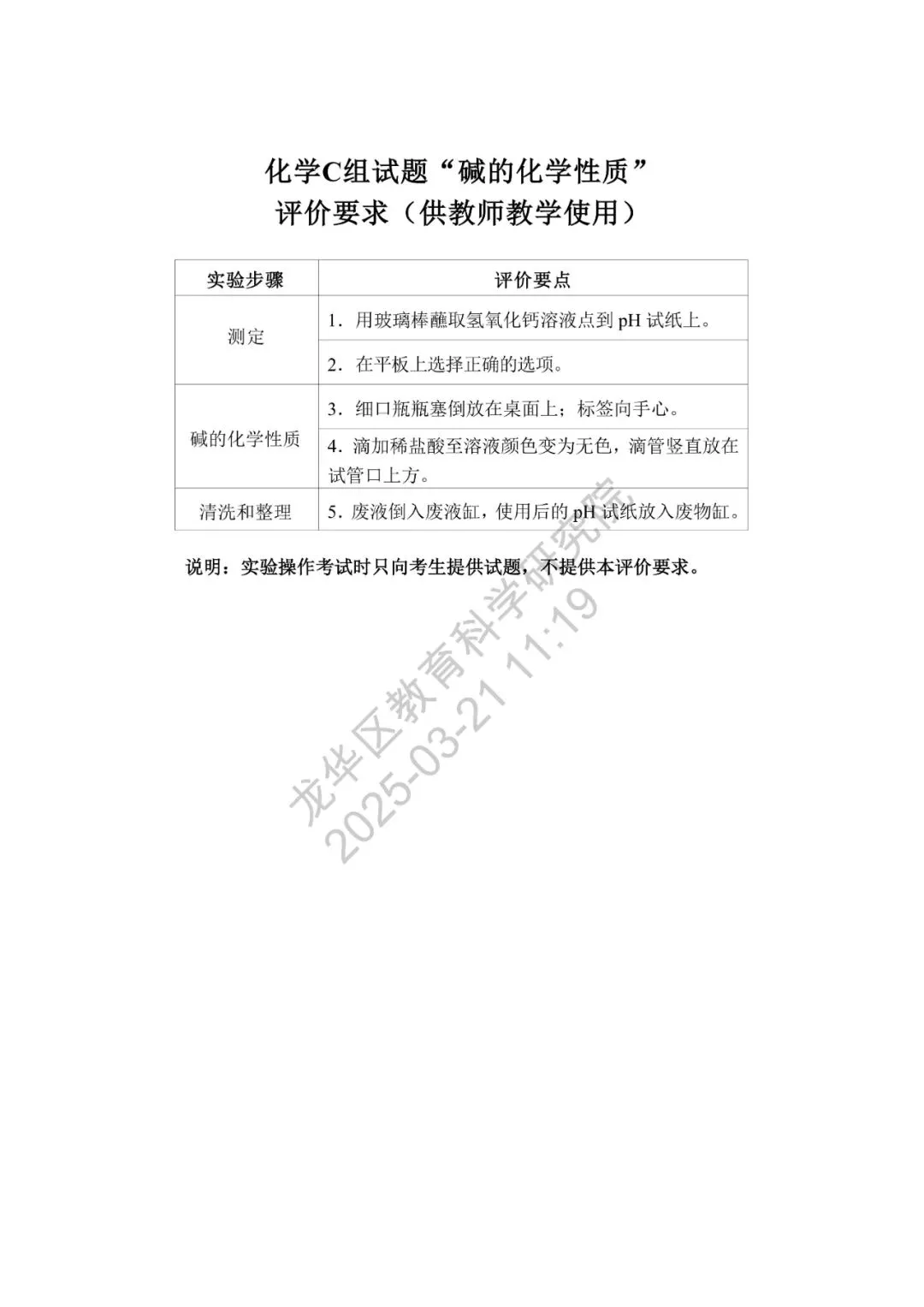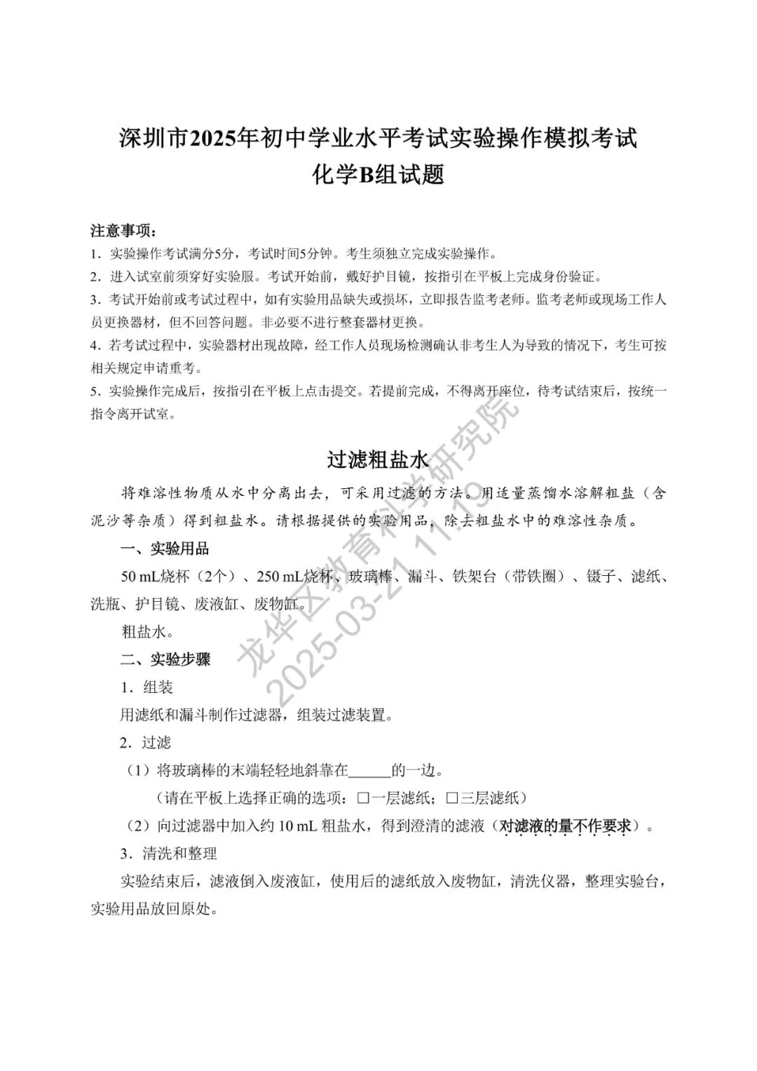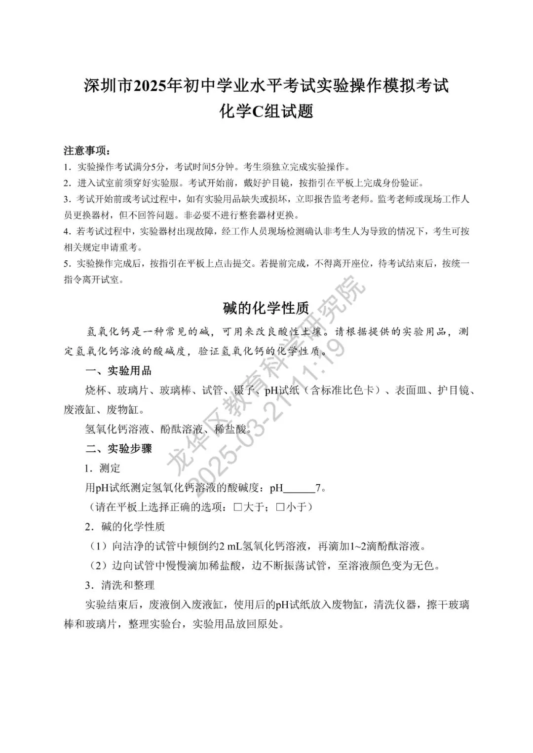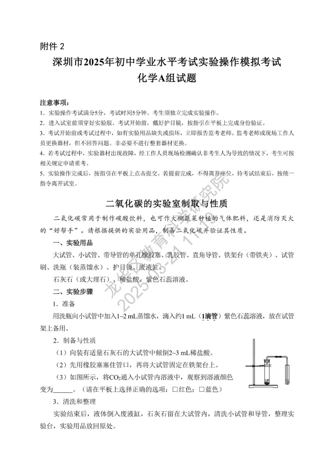 深圳市2025年初中学业水平考试化学实验操作模拟考试满分5分,考试时间5分钟,模拟试题、评价要求、实验用品清单如下。