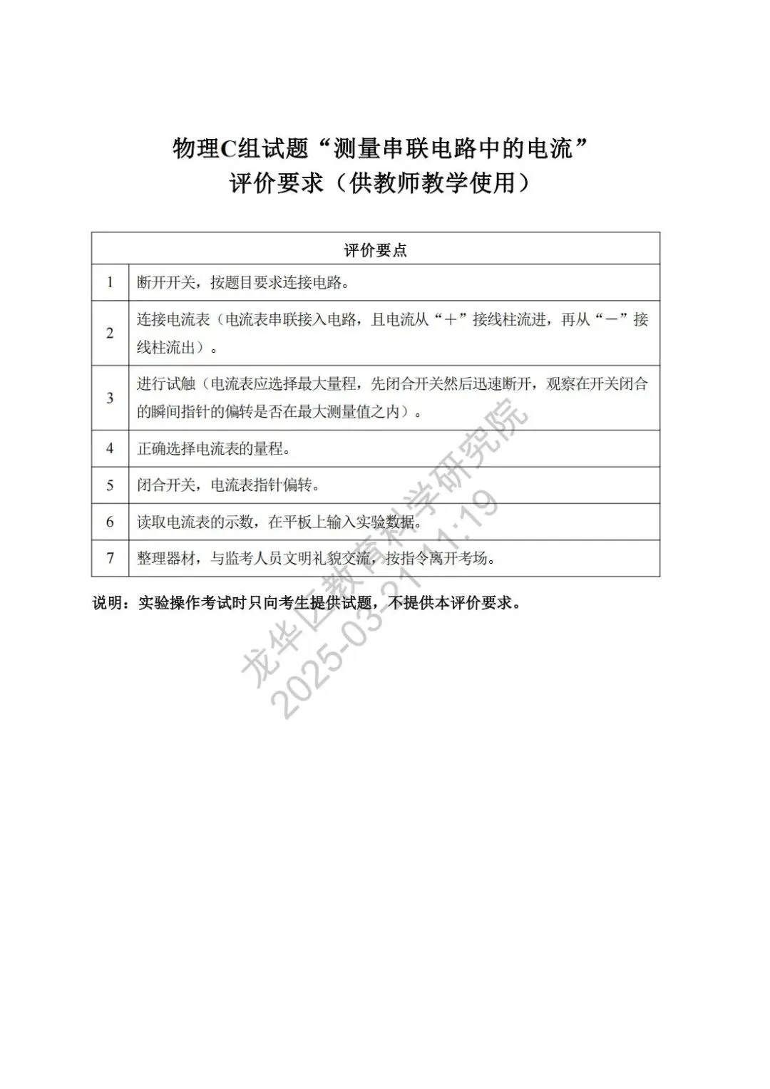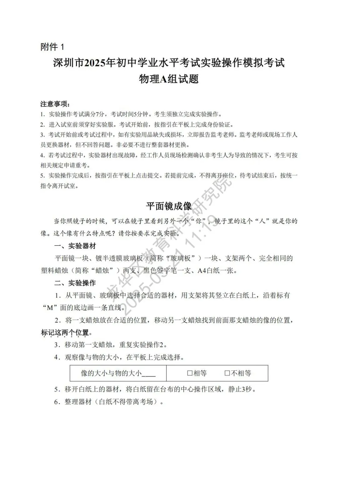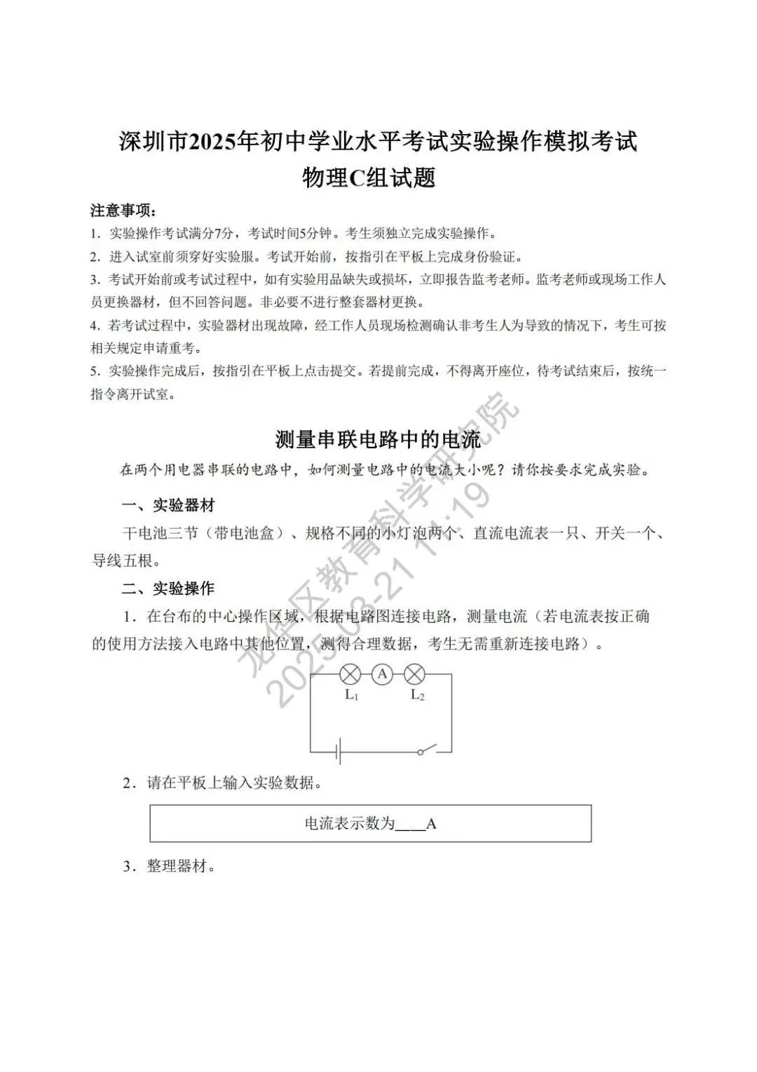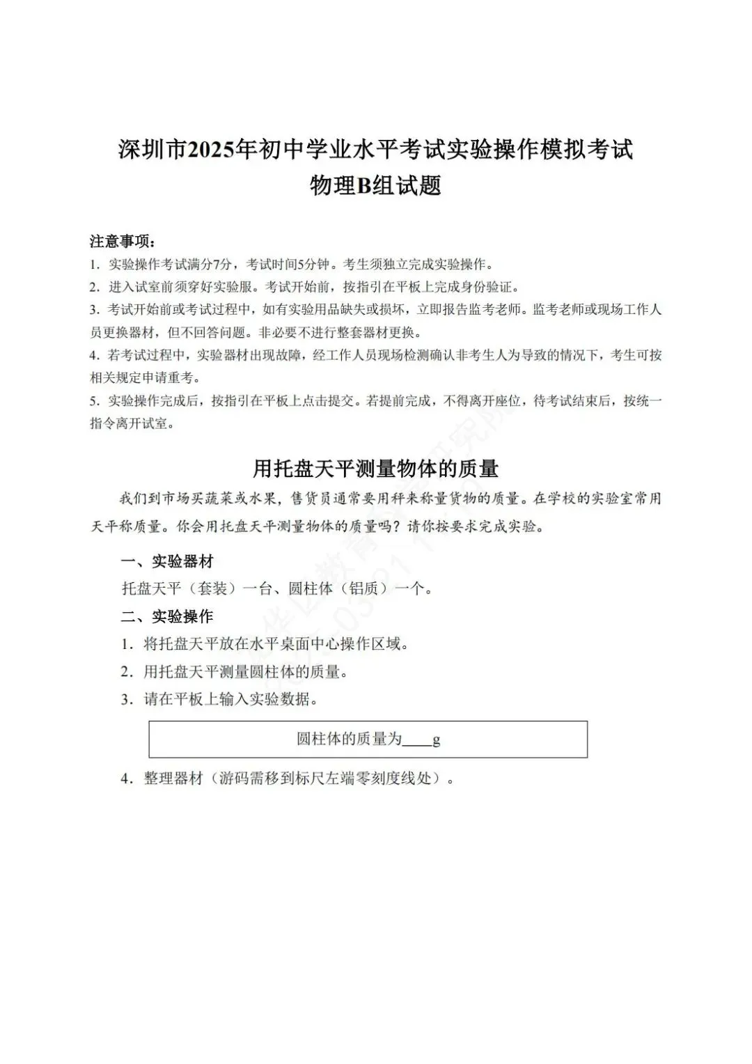 深圳市2025年初中学业水平考试物理实验操作模拟考试满分7分,考试时间5分钟,模拟试题、评价要求、实验用品清单如下。