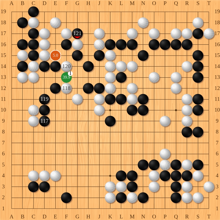 第215手,中腹定型,硝烟散尽,中国棋迷惊喜地发现,屠晓宇胜率还有90%,有约16目的优势,大家都松了一口气。看来,申真谞在混战中,真的没有什么优势。