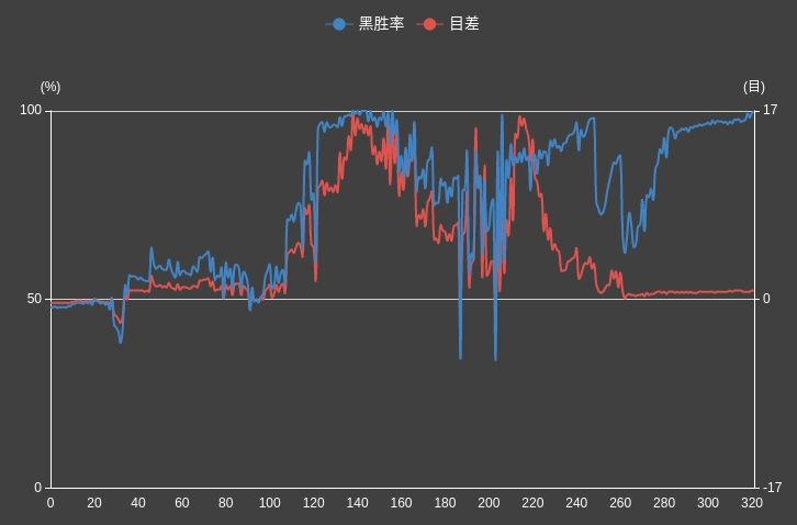 率先出状况的是申真谞,他在第108手出现失误,掉了约20%的胜率,屠晓宇开始领先。