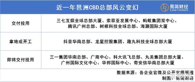 易简财经统计,近一年琶洲CBD投用的总部数量,足足有6座,包括三七互娱、蚂蚁集团双中心、腾讯广州总部等知名企业。